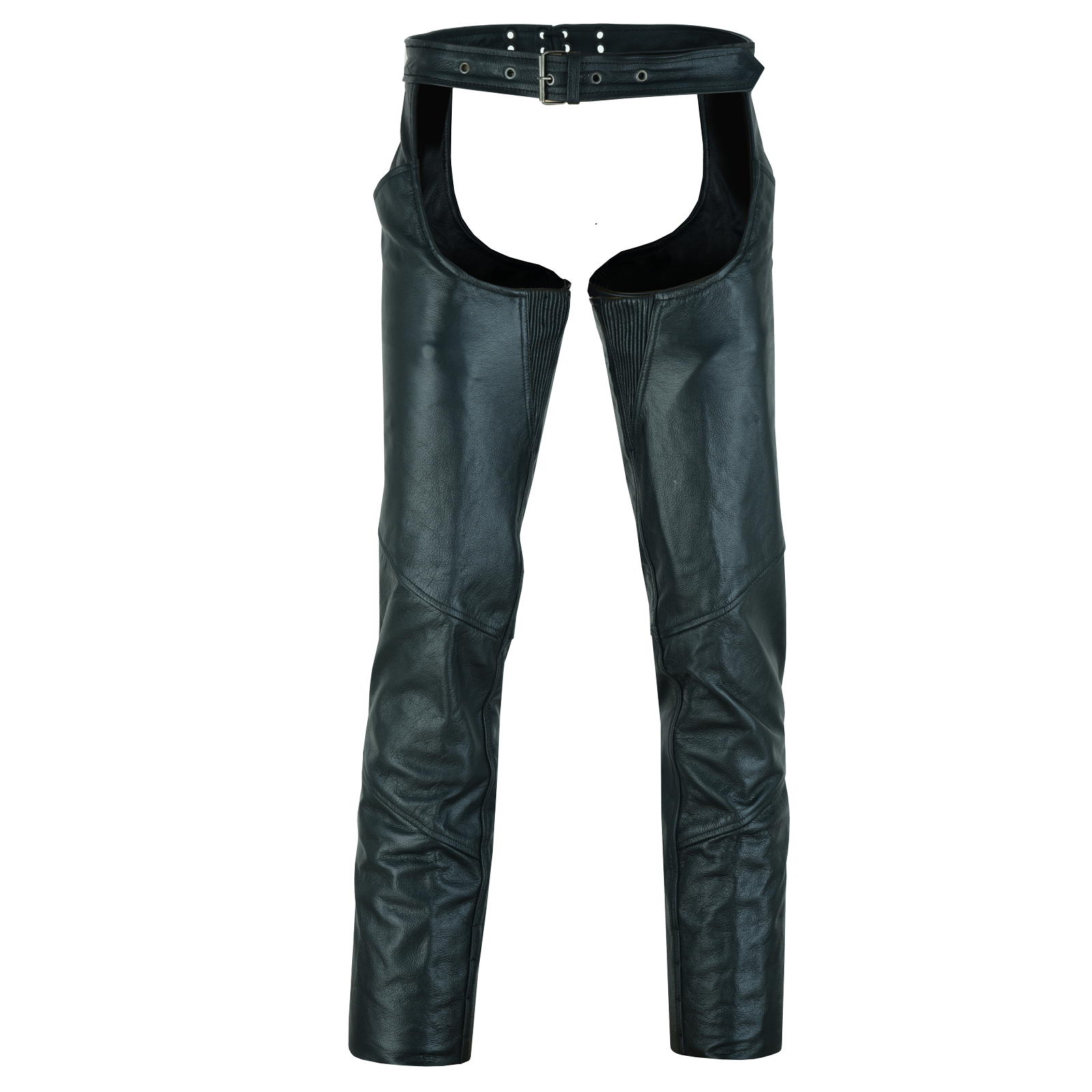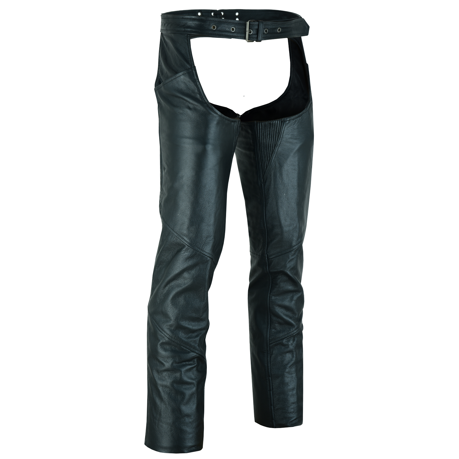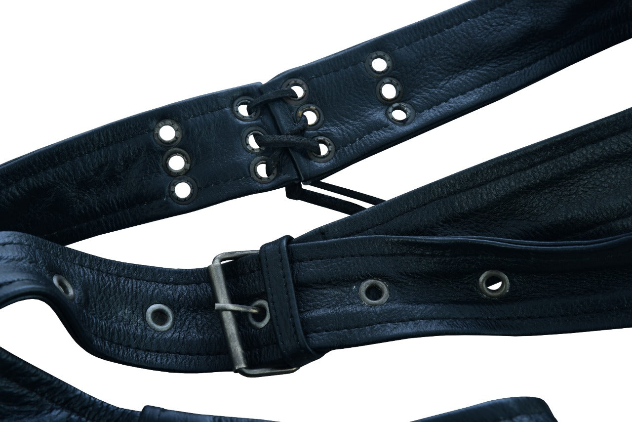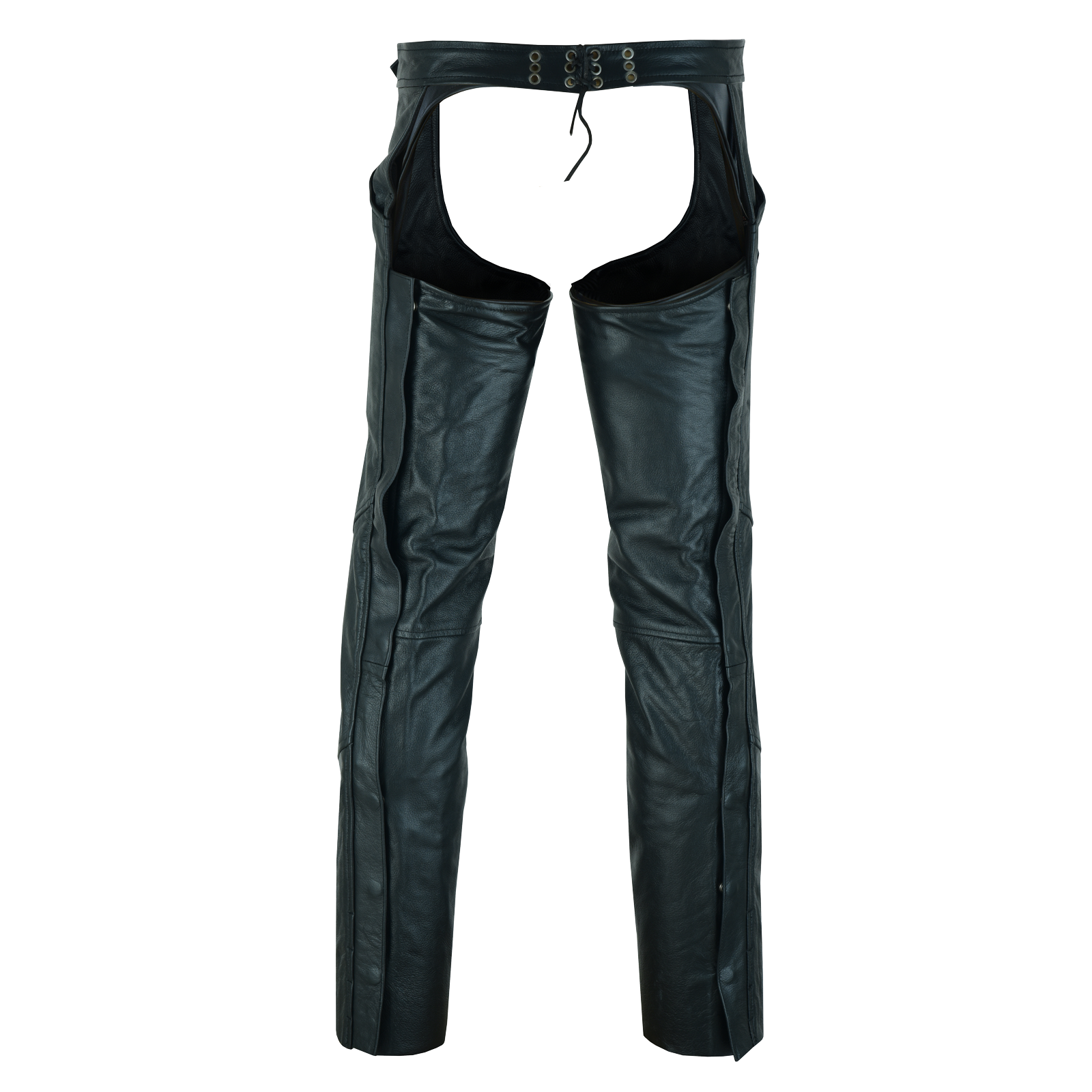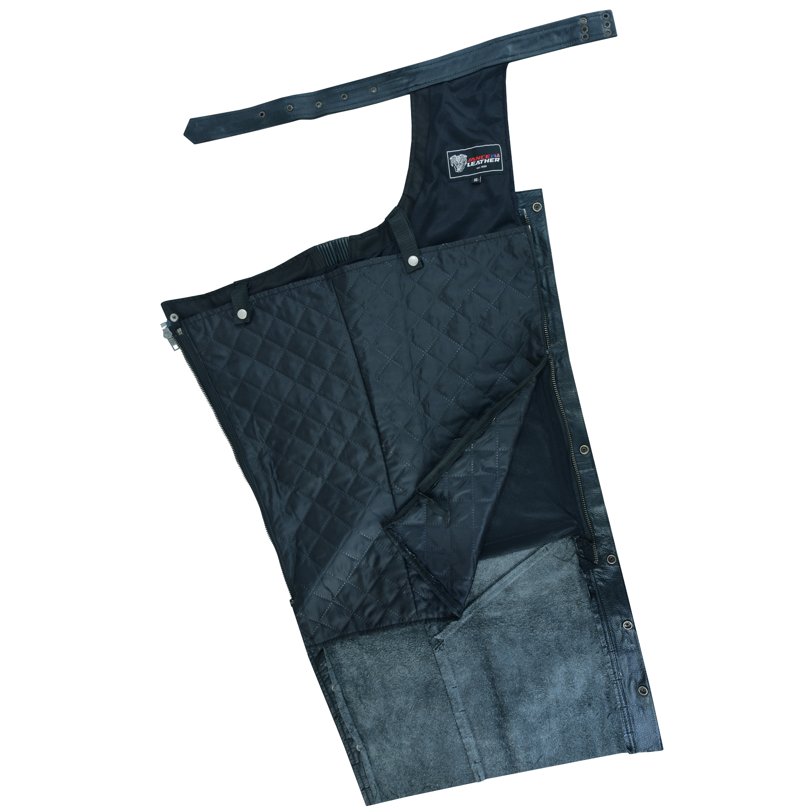 Pant Style Leather Chaps with Zip-out Insulation and Mesh lining is designed for those days when there is a chill in the air but you still want to go out riding. These are high-quality chaps that are constructed out of thick buffalo leather, which is an economical but very durable hide. The waist of the Pant Style Leather Chaps with Zip-out Insulation and Mesh Lining features a traditional belted front that can be adjusted further via the lace-up adjustment panel. The pant style in this item s name refers to the pockets on the front of these chaps, which are similar in placement and style to those on a classic pair of jeans.