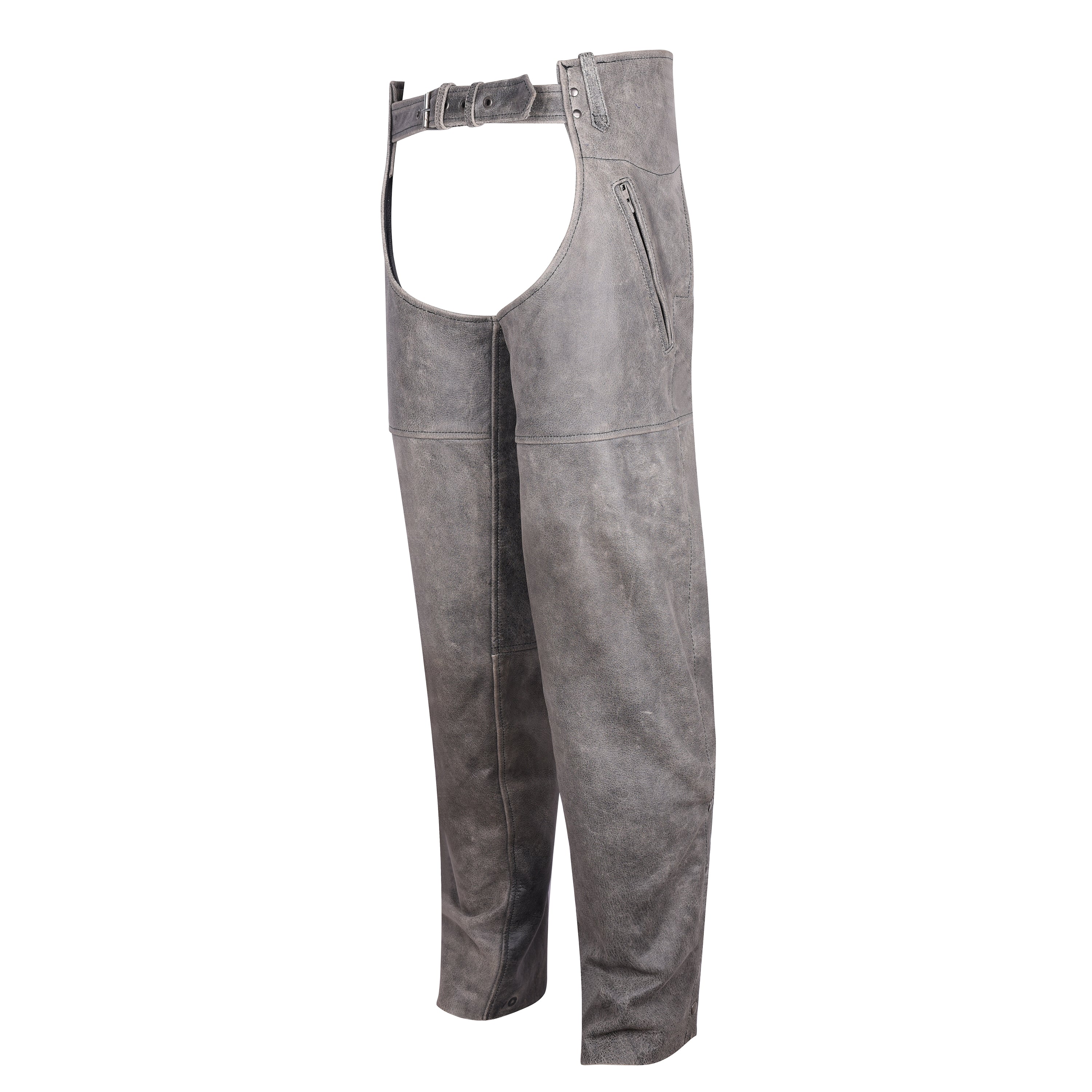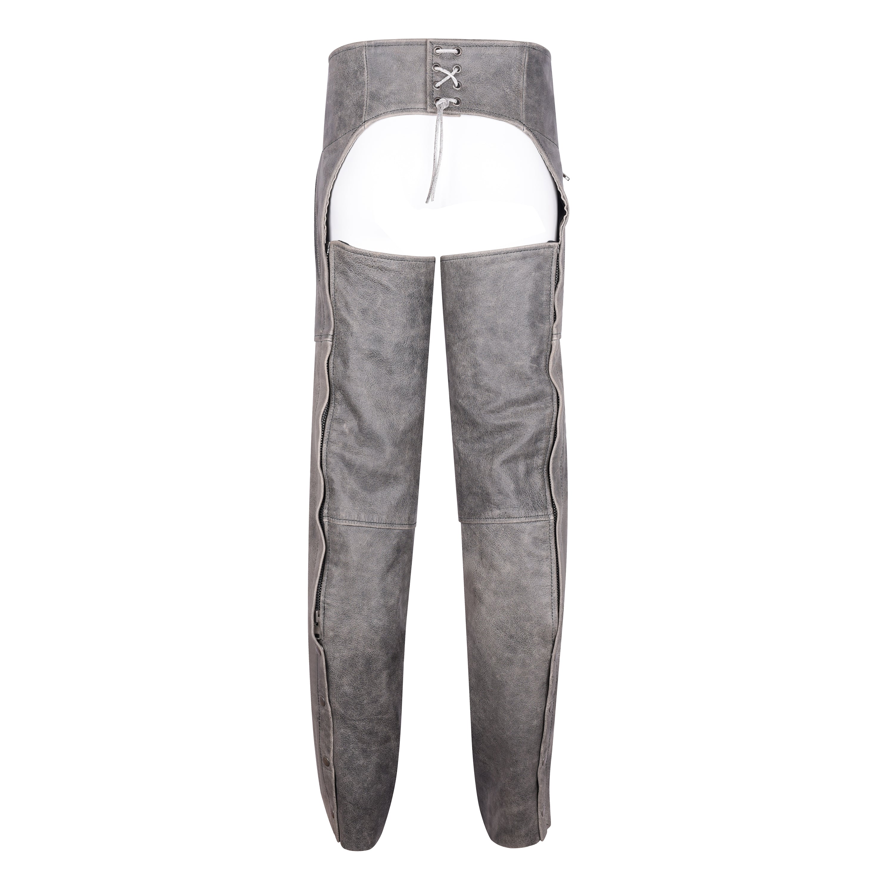 High Mileage Distressed Grey Leather Chaps with a quilted lining are designed using a highly durable, premium quality leather. These high quality chaps are designed with a quilted inside lining. Ride the open road with confidence sporting a pair of our exclusive leather chaps and show off your authentic biker style!