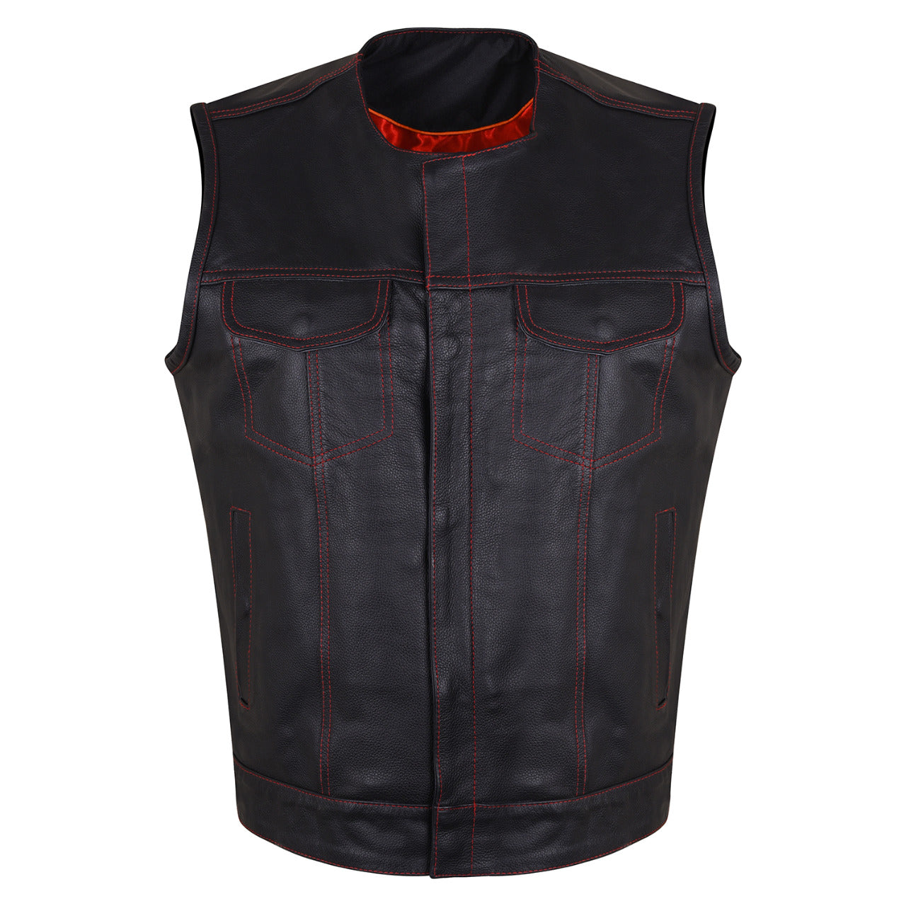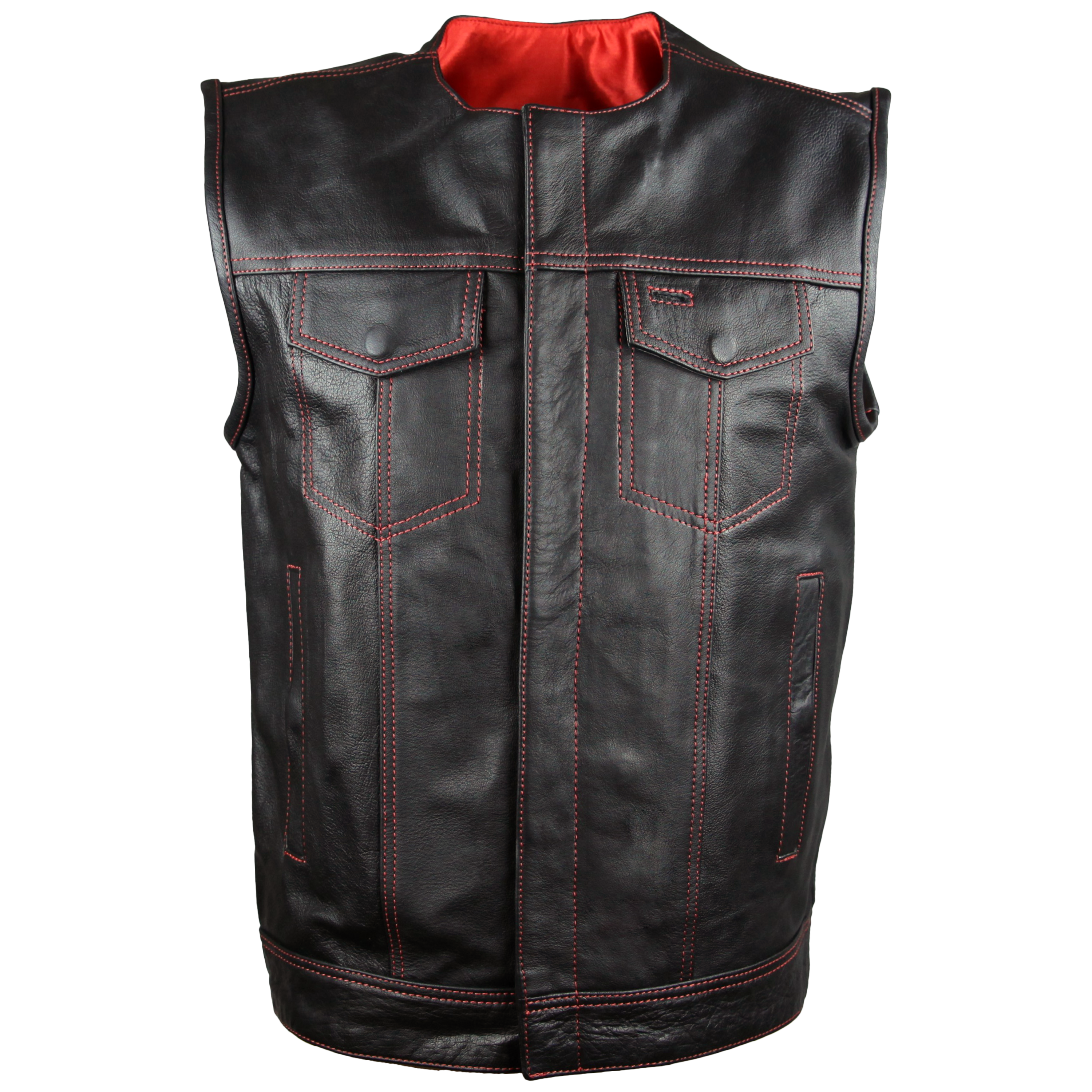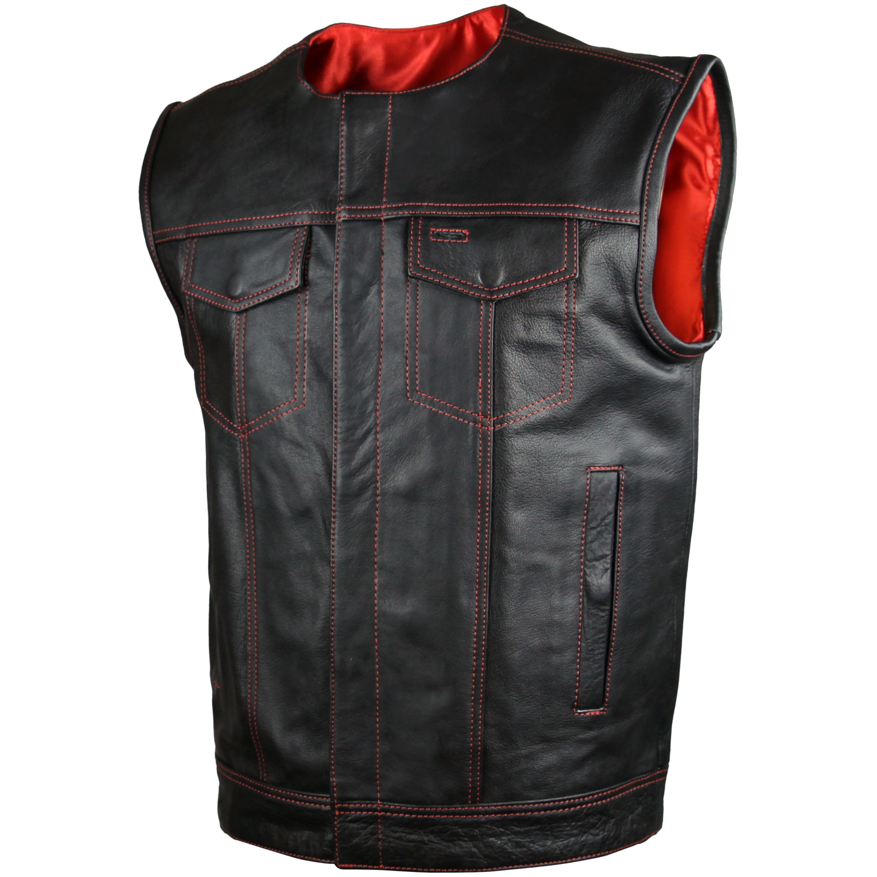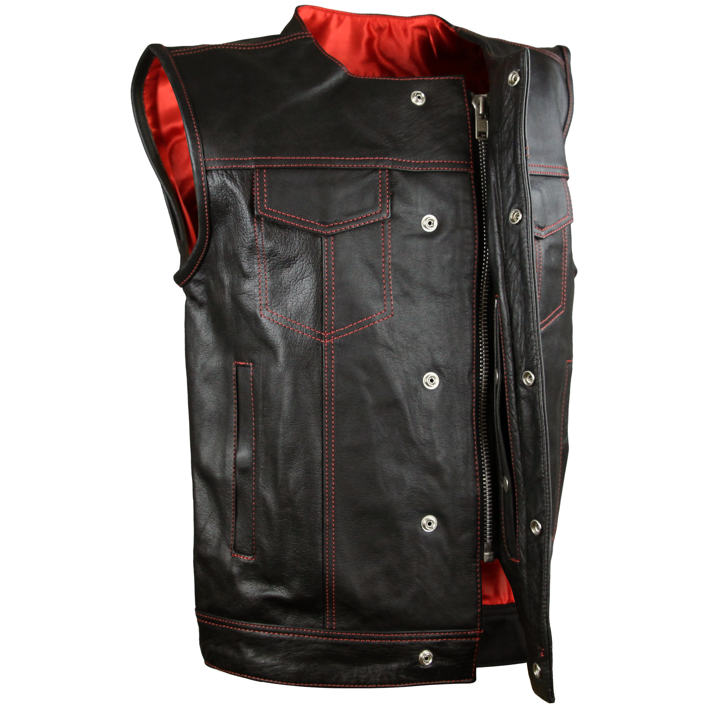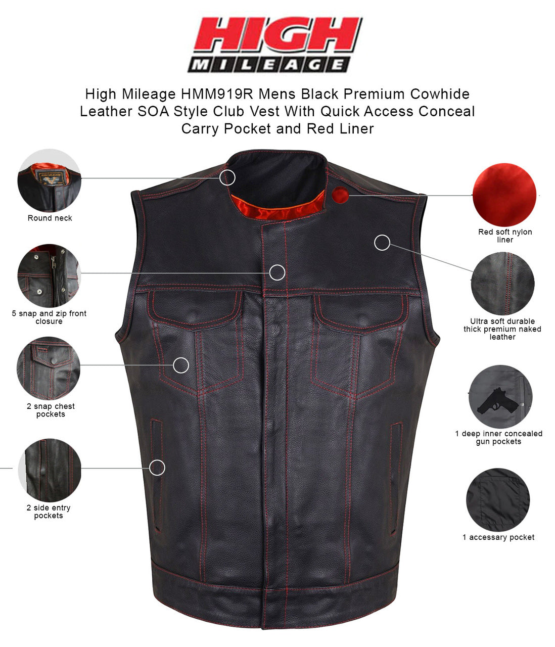 High Mileage Men's Zipper and Snap Closure Leather Club Vest Quick Access Gun Pocket w/Red Liner