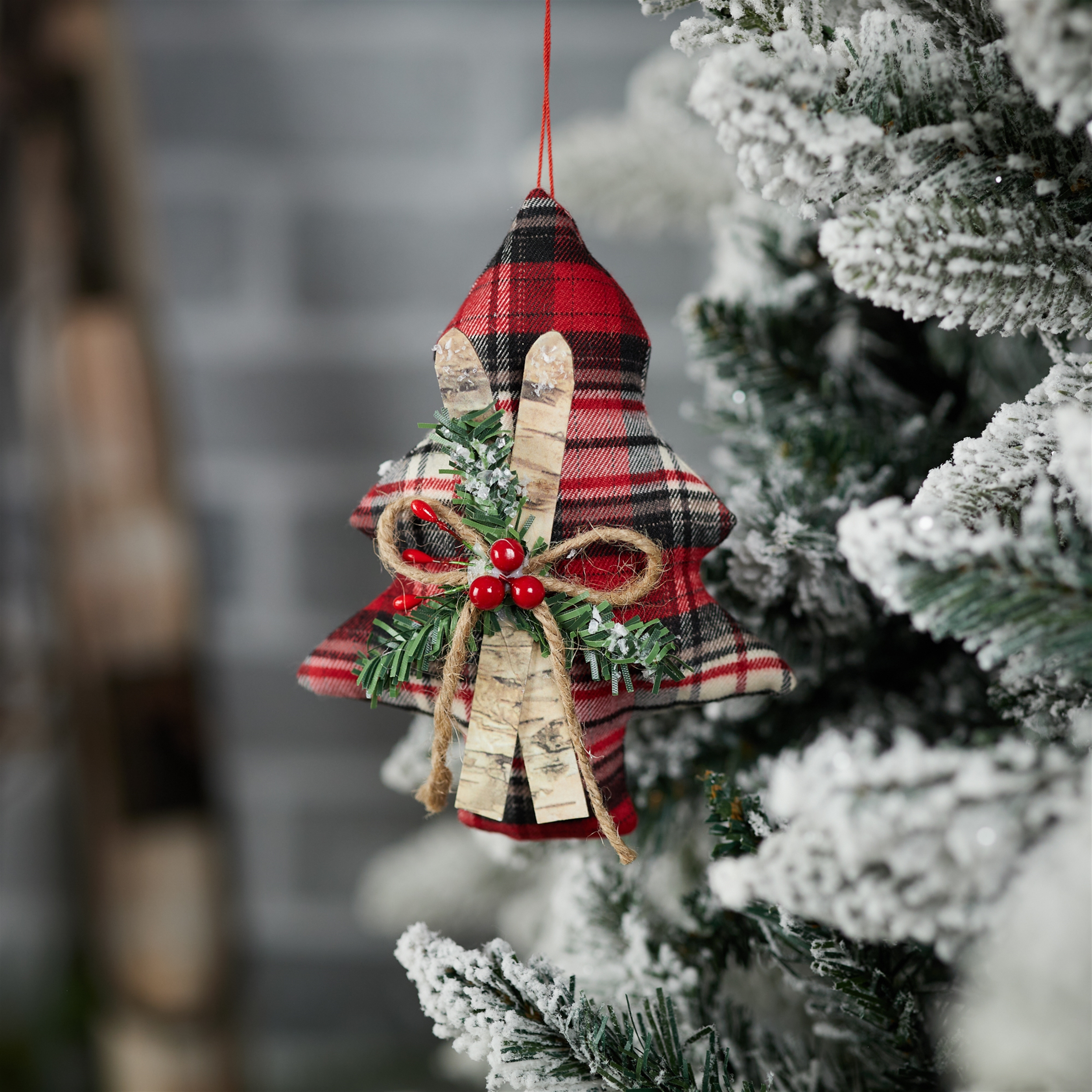 Add a cozy, cabin-inspired touch to your holiday d cor with this Set of 12 Tree with Skis Ornaments. Crafted from soft polyester with a classic red-and-black plaid pattern, each ornament features charming mini skis, a burlap base, and pine sprigs tied with twine bows. Perfect for rustic, woodland, or farmhouse holiday themes, these ornaments bring warmth, texture, and personality to your Christmas tree or wreath.