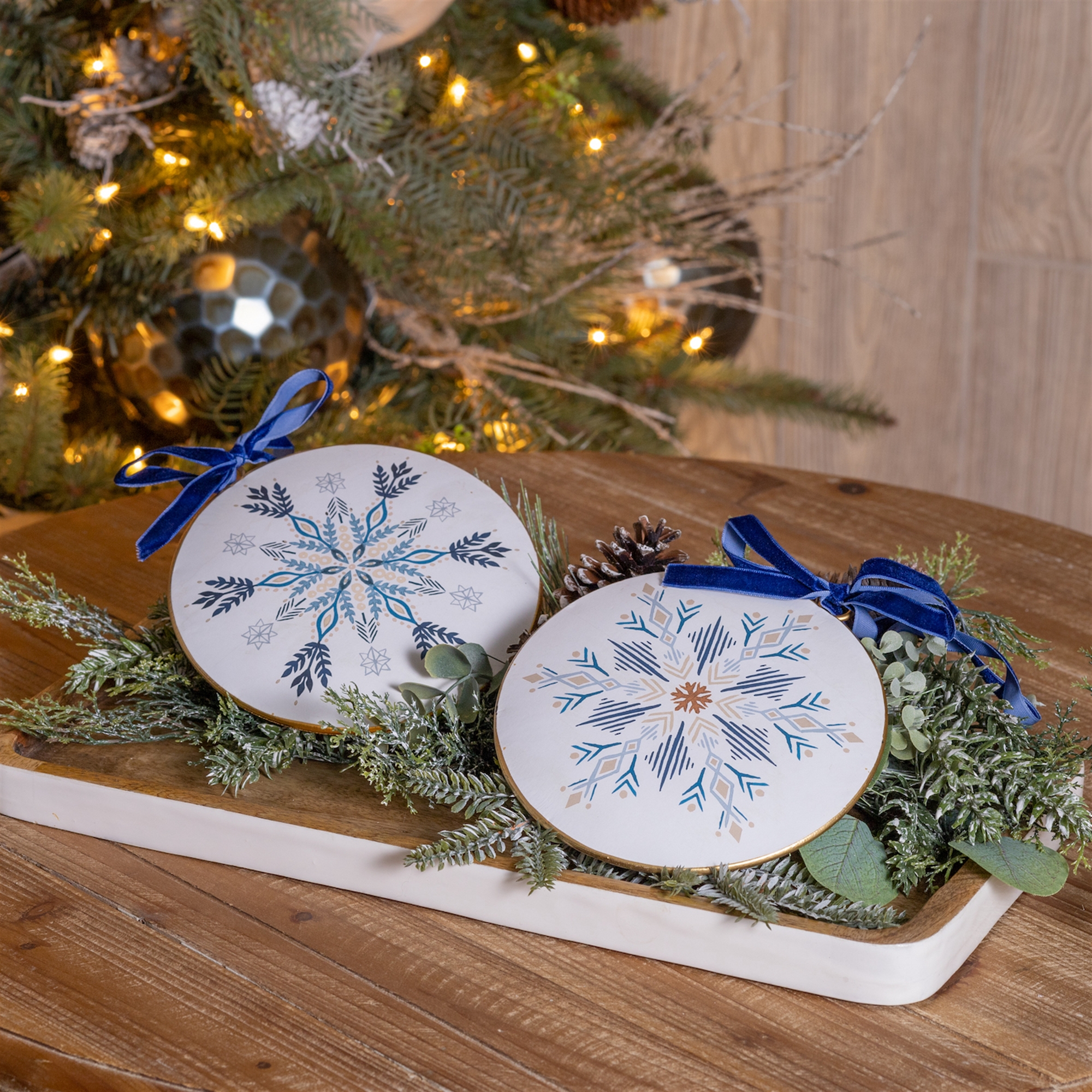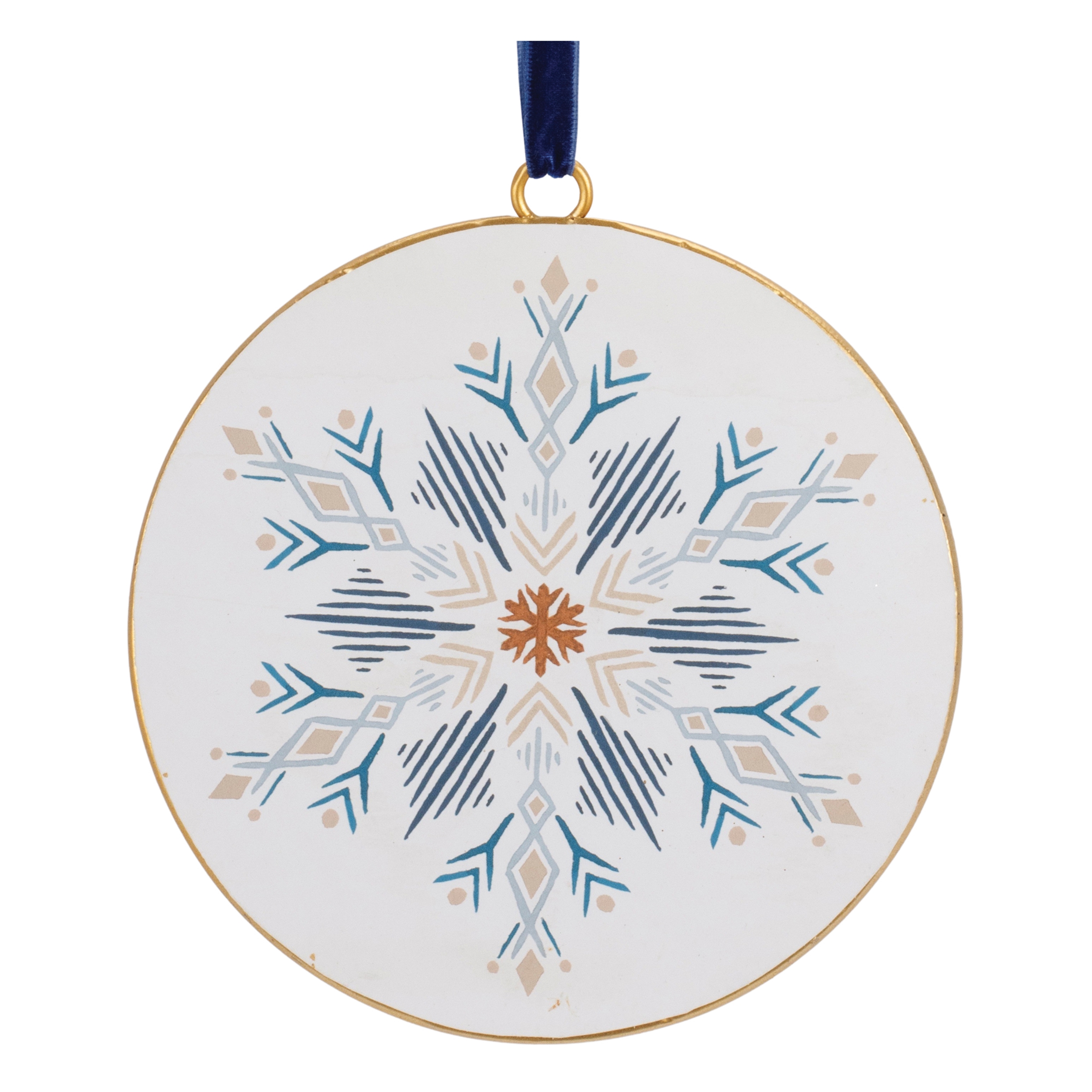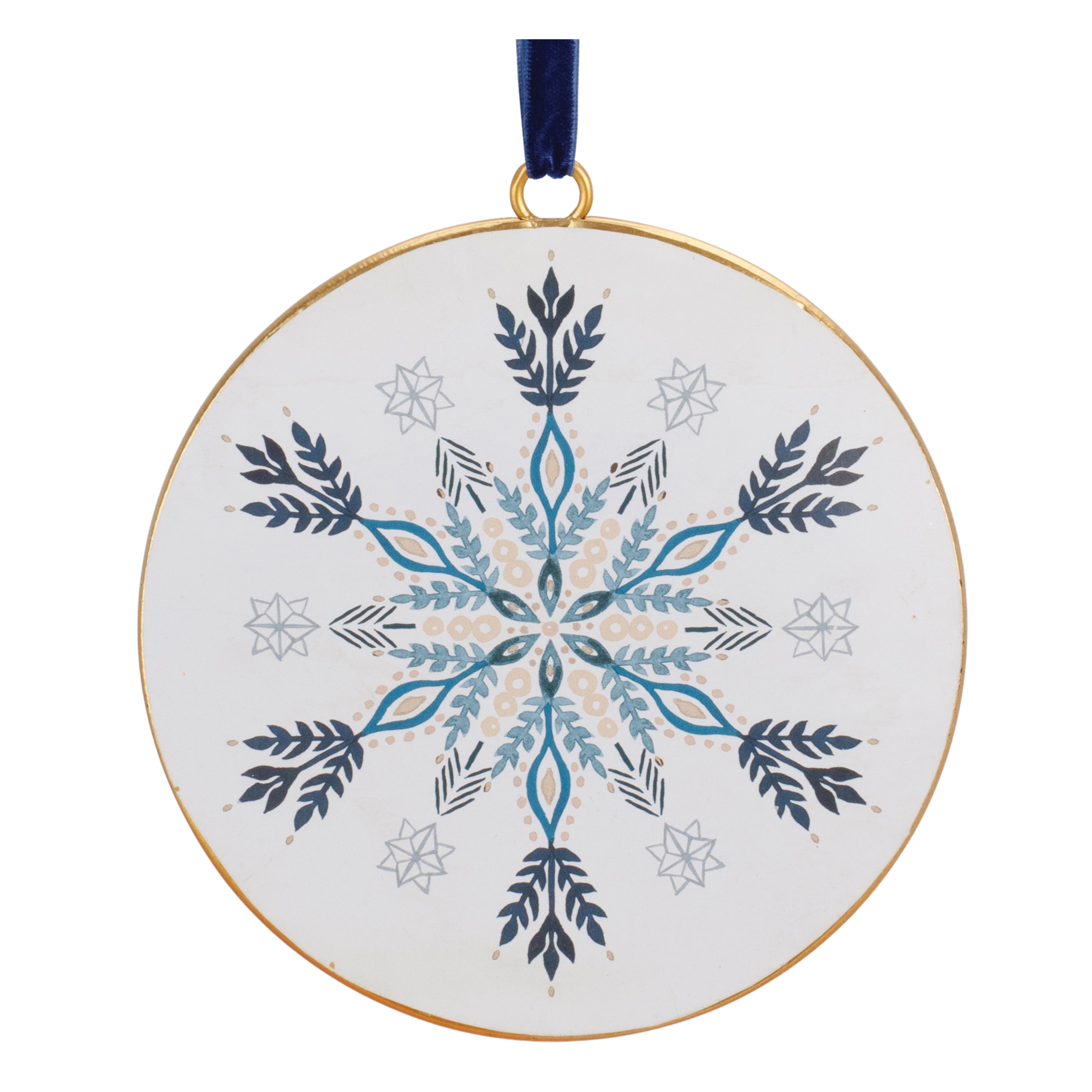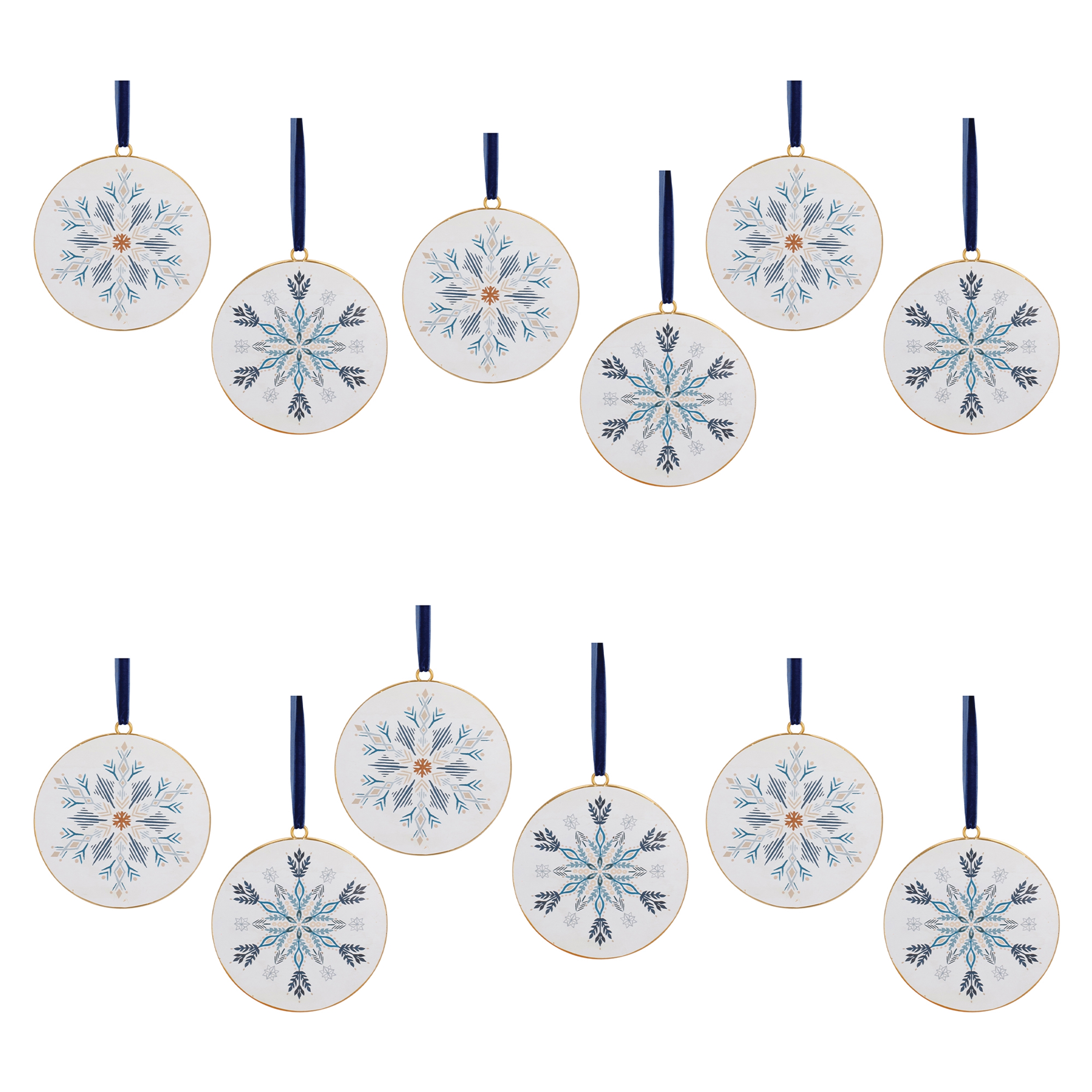 Adorn your Christmas tree with this stunning set of Ornate Snowflake Disc Ornaments. Featuring 12 pieces, the wintry blue and white tones paired with the modern snowflake design are the perfect combination to create a memorable display. The iron metal composition with delicate red ribbon hanger is sure to endure for seasons to come. Whether you're adding a touch of cheer to your home or gifting to a loved one, these ornaments will definitely bring holiday spirit to your home.