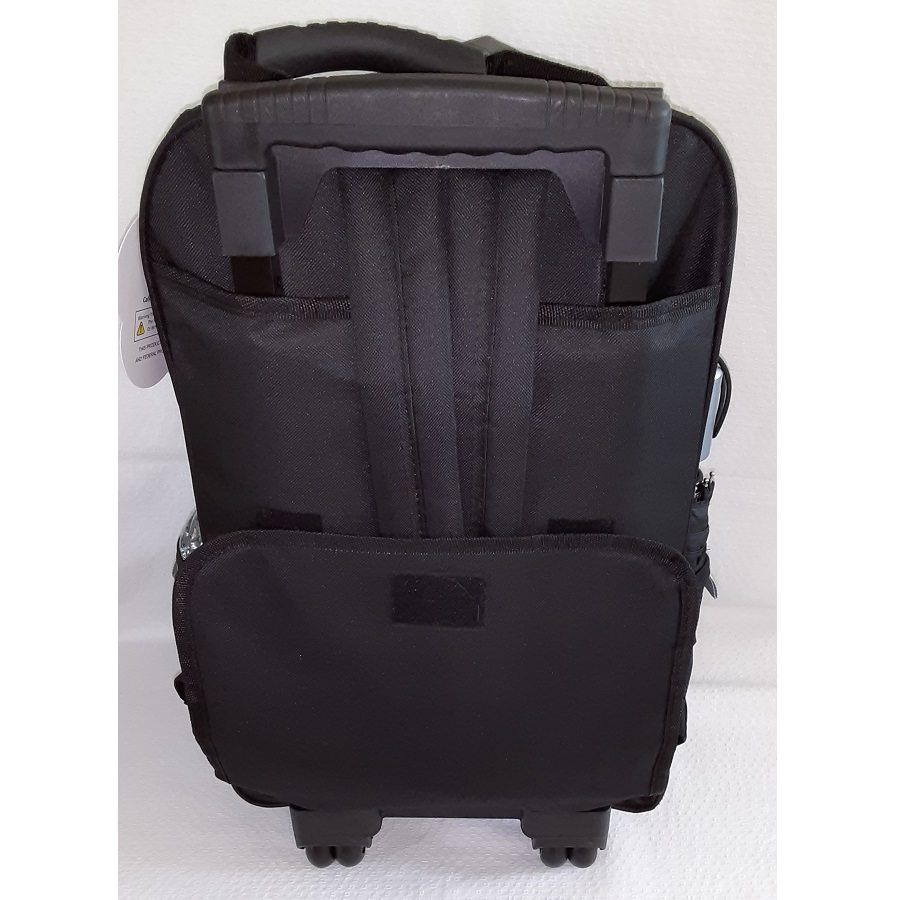 • This travel carry-on rolling backpack is roomy and practical with a telescopic pull out handle as well as the traditional backpack back straps.
