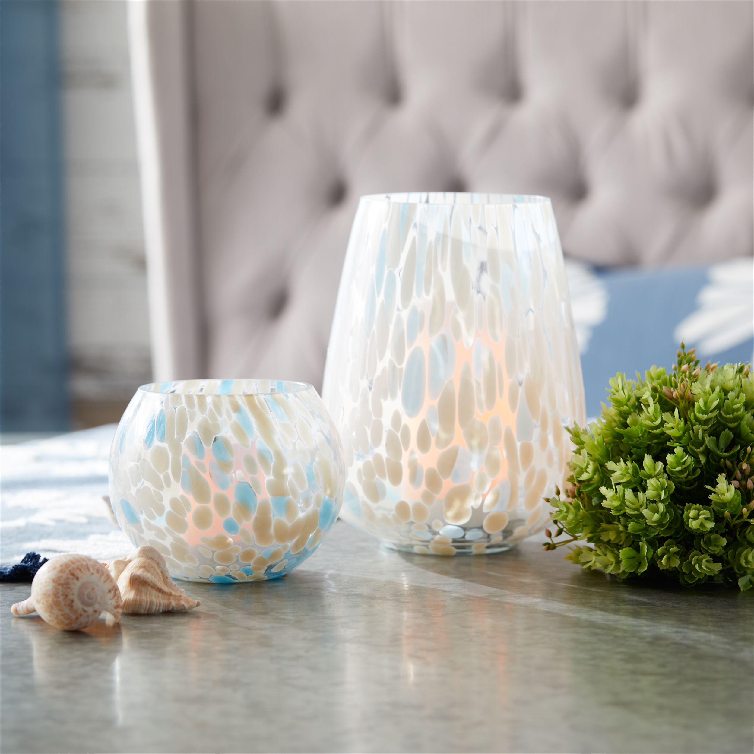 Bring a touch of coastal charm to your home with the Painted Glass Candle Holder Vase Set. Featuring cool blue and white tones with an abstract painted design, these holders add a chic aesthetic to any space. With a clear finish and versatile design, they are perfect for holding pillar or votive candles, or can be used as vases to display fresh flower stems. Sold in a set of four, these holders elevate any room with their stylish, multi-functional design.