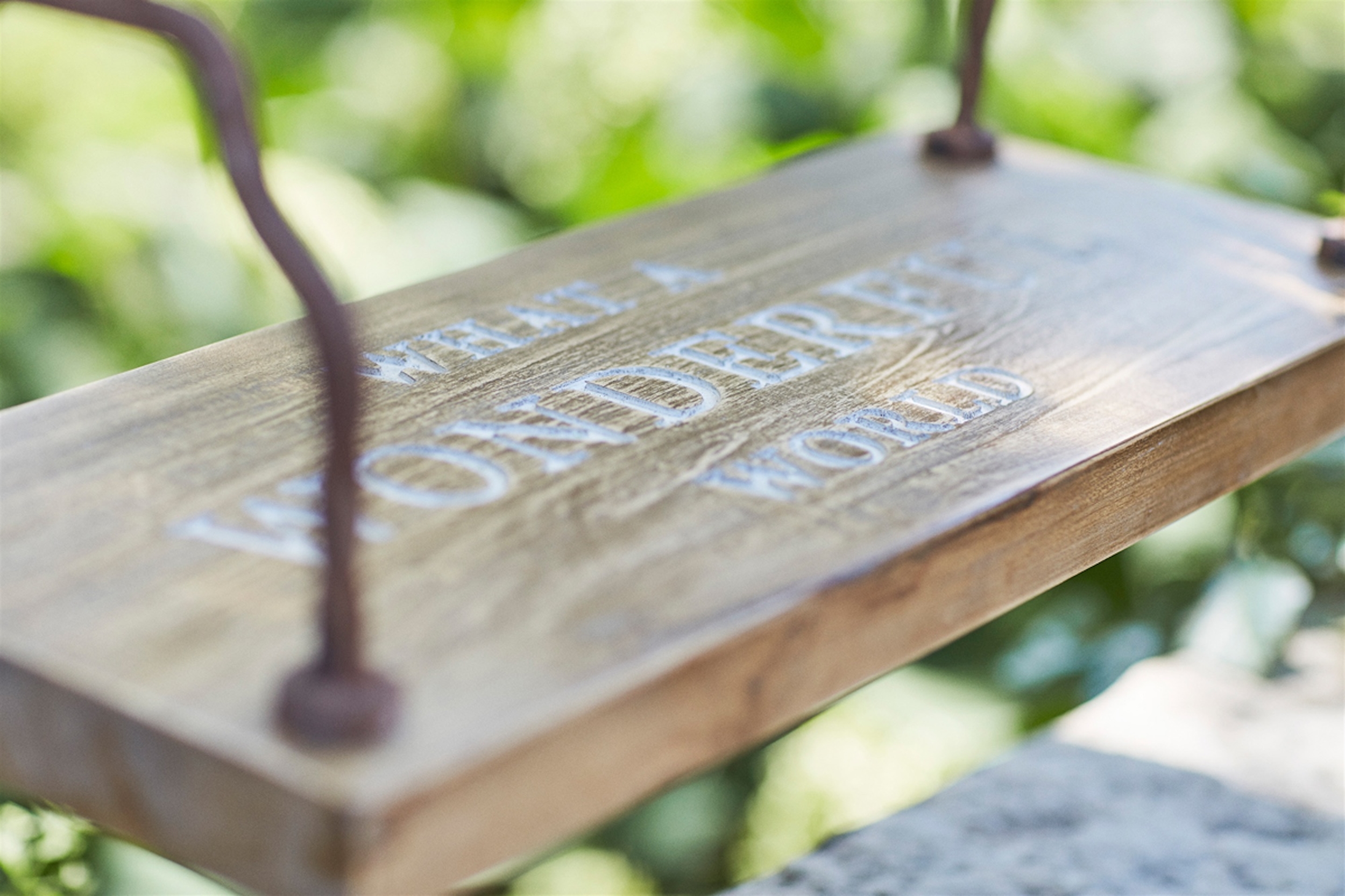 Bring a touch of joy and charm to your garden with the "What a Wonderful World" Wood Garden Swing. This beautifully crafted swing features a sturdy natural poplar wood seat and rustic iron metal handles, making it the perfect addition to your outdoor space. Whether you're relaxing in your yard or adding a whimsical touch to your garden, this swing brings comfort, beauty, and positive energy. Please note, the rope for hanging is not included. Ideal for adult use and child-supervised play, this swing is sure to be a conversation starter for family and friends alike.