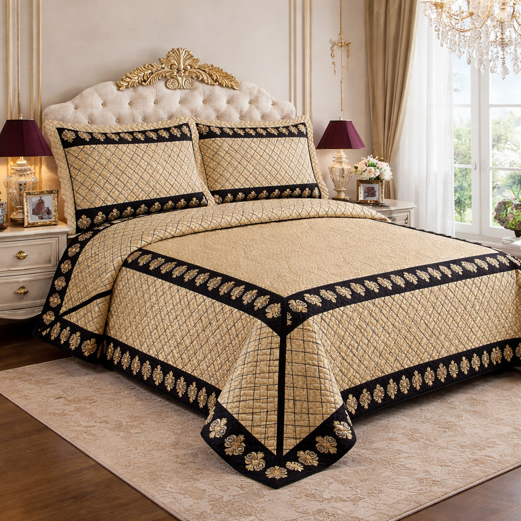 Damascus - Luxury Plush Quilted Bedspread with 3D Embroidery Vintage Royal Gold Design