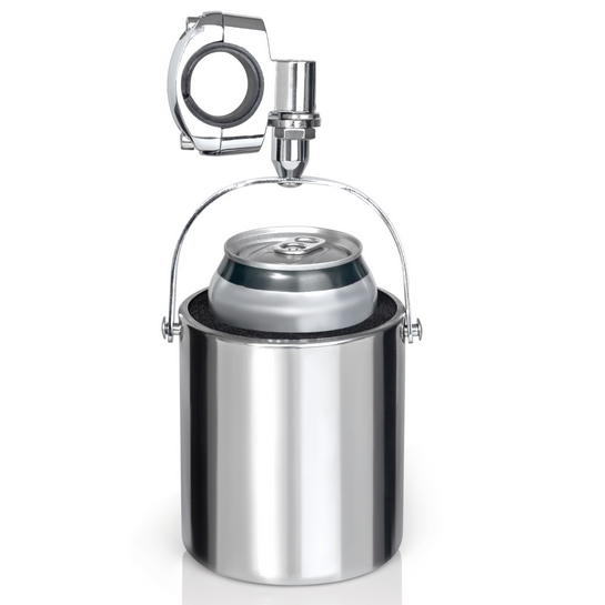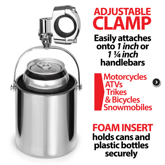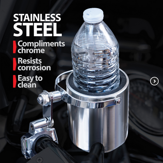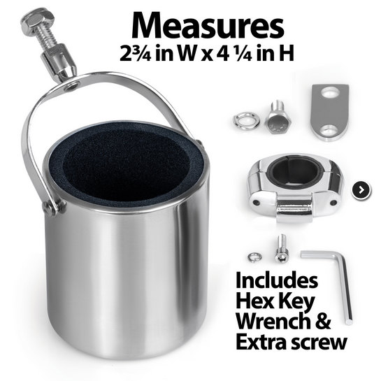 Quench your thirst on the go and stay hydrated on the open road with the Diamond Plate Stainless Steel Motorcycle Cup Holder. Features adjustable clamp to easily attach to motorcycle or bike, foam cup insert and hex key wrench plus extra screw. Fits both 1 and 1-1/4 handlebars. Holder measures 2-3/4 x 4-1/4 . Gift boxed.
