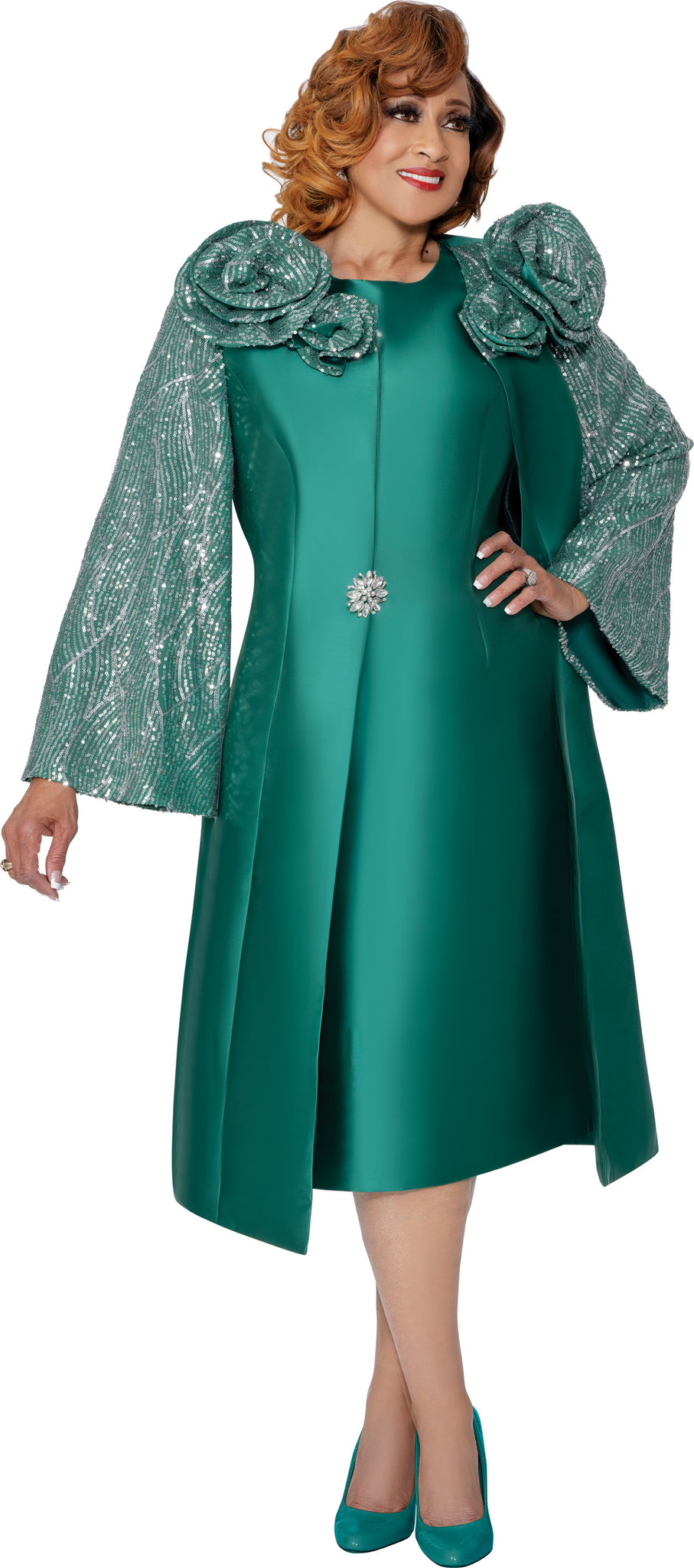 This elegant green church dress features dramatic cape sleeves adorned with shimmering beadwork and oversized floral appliqués on each shoulder, creating a standout silhouette for special occasions. Crafted in a rich satin fabric, its midi length and modest neckline offer sophistication and grace, while the sparkling crystal brooch accent adds a touch of glamour. Perfect for women seeking to make a lasting impression at church services, ceremonies, or festive gatherings, this DCC design combines refined tailoring with bold, statement details inspired by the season's most fashionable churchwear trends.