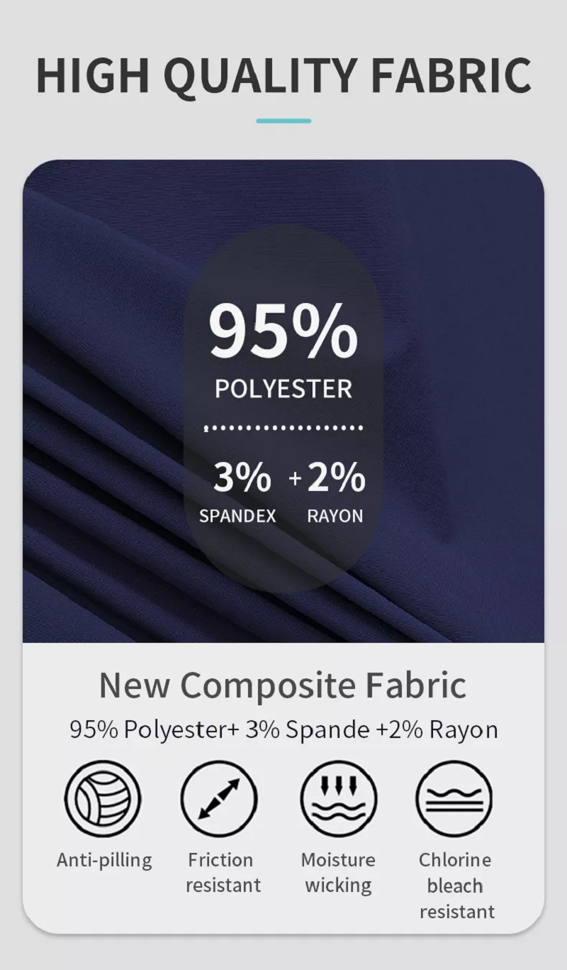 Soft and breathable fabric, anti-pilling, friction resistant, moisture wicking, chlorine bleach resistant.