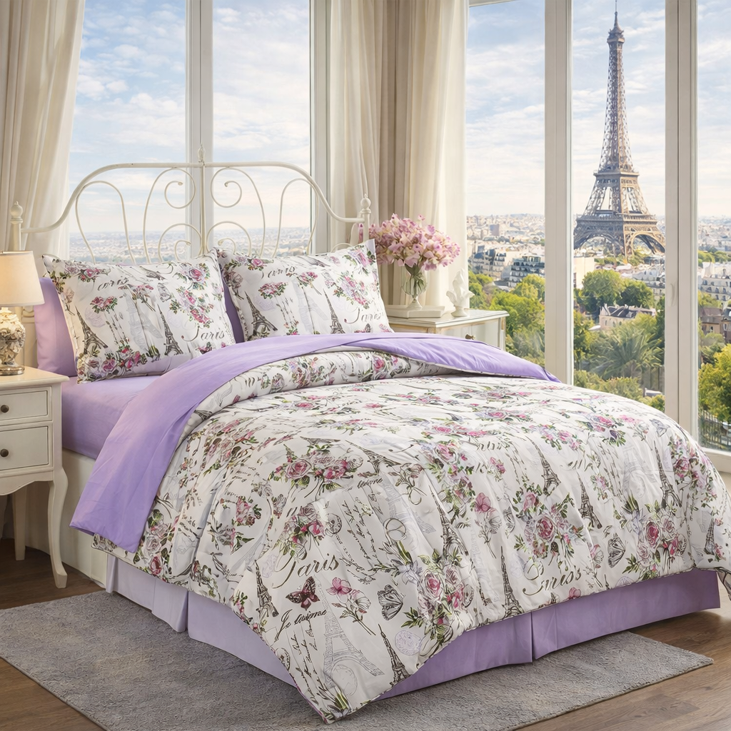 Bring romantic Paris-inspired charm into your bedroom with this 8-piece comforter set featuring floral patterns and classic Paris city scenery. Designed as a complete, coordinated bedding solution, this set instantly refreshes your space with color, comfort, and style.
