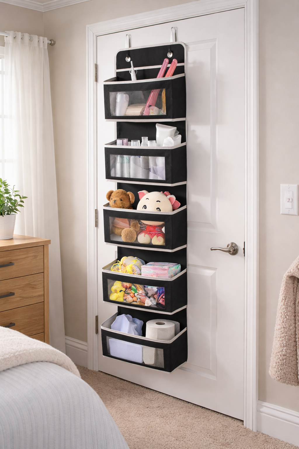 Over the Door Hanging Storage Closet Organizer Clear Window 5 Pockets + Dividers - Gray