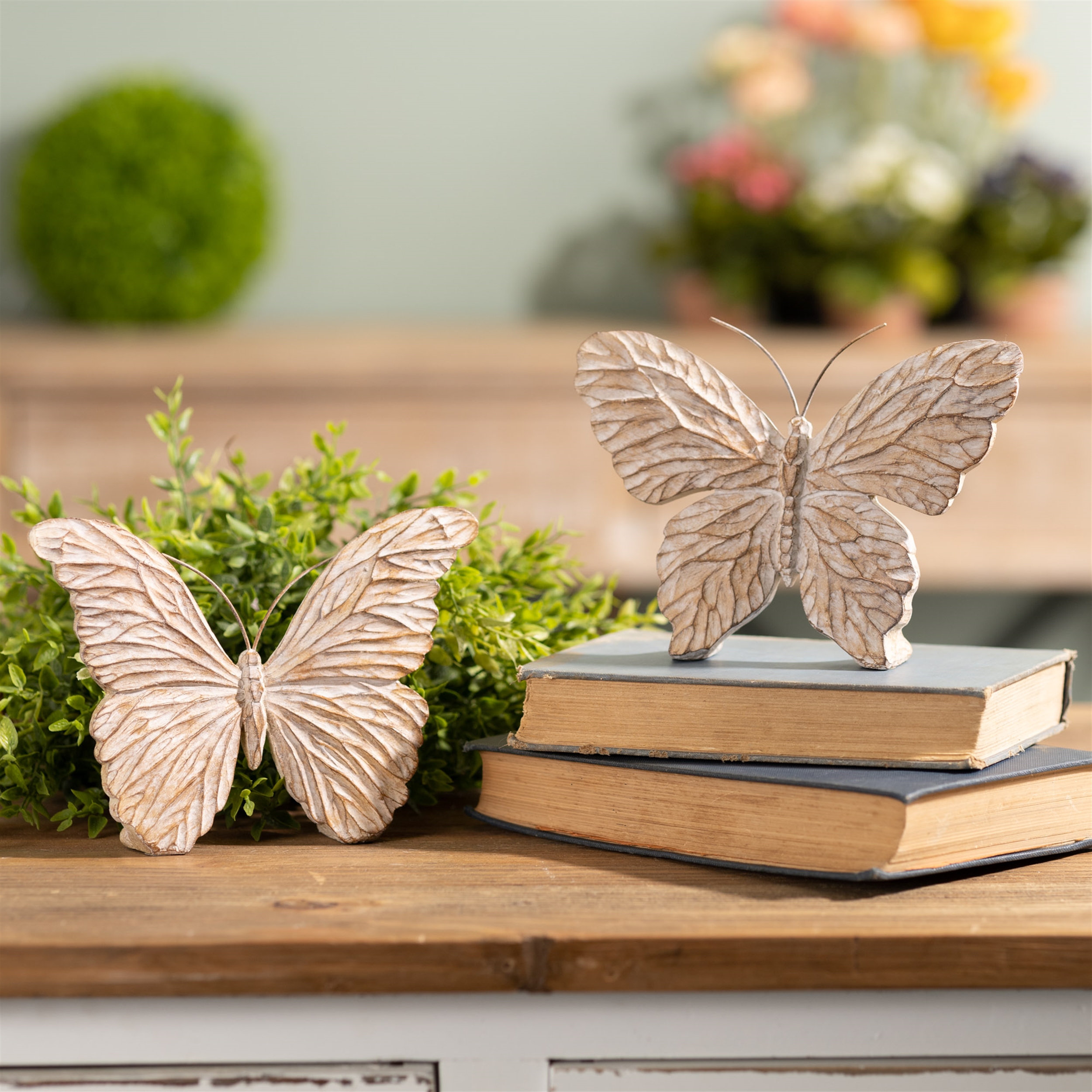 Bring nature's beauty indoors with this set of Carved Butterfly Shelf Sitters. Designed in trendy beige tones with a white-washed finish, each piece features intricate carved wing details and metal antennae accents. Perfect for boho, country cottage, or nature-inspired decor, these delicate butterflies add a modern yet timeless touch to your shelves, coffee table, or mantel. Crafted from durable polyresin and metal, this set will endure and elevate your space for years to come. Whether you're enhancing your own decor or gifting to a nature-lover, these butterflies are sure to delight. Sold in a set of four pieces with two assorted designs to create a meaningful display in your home.