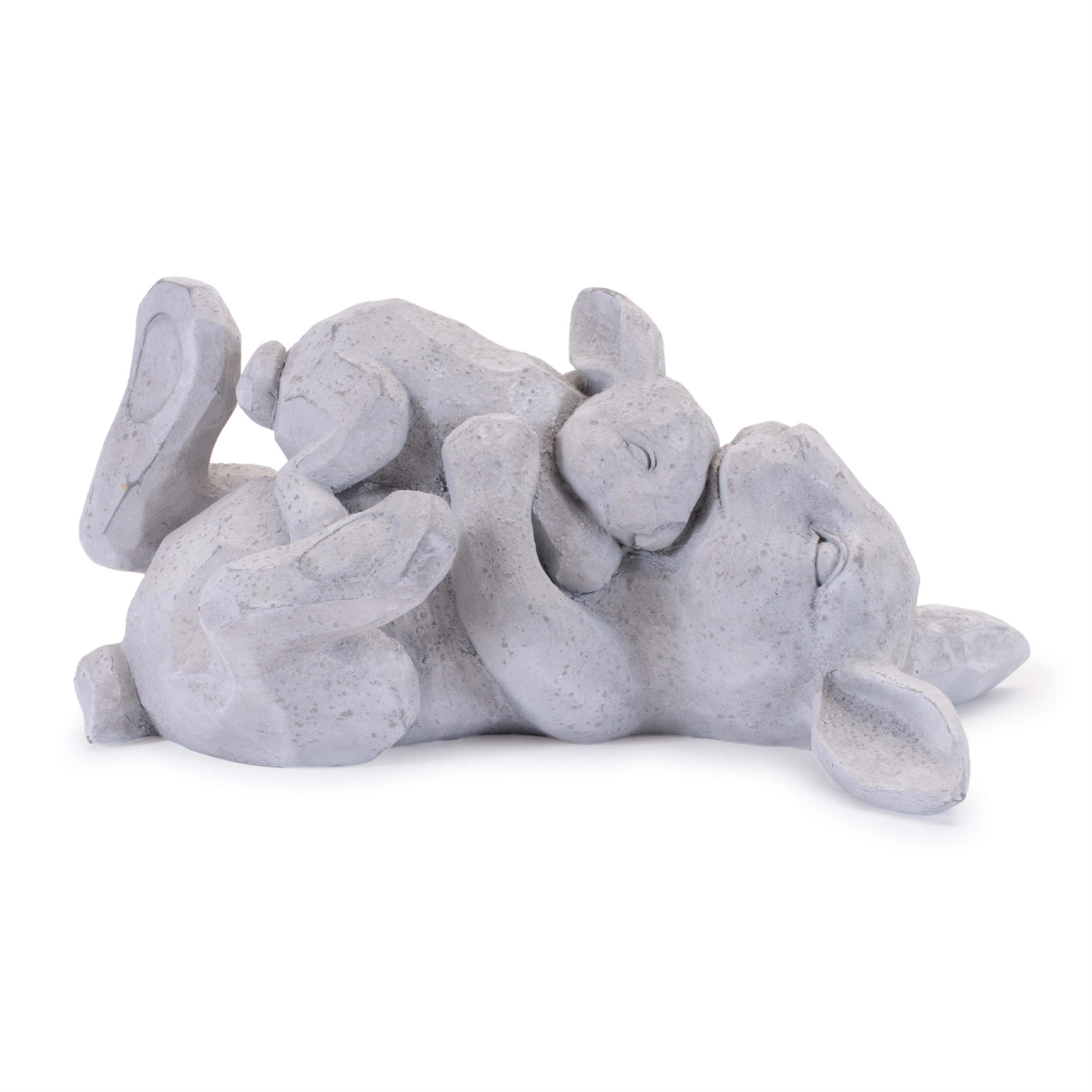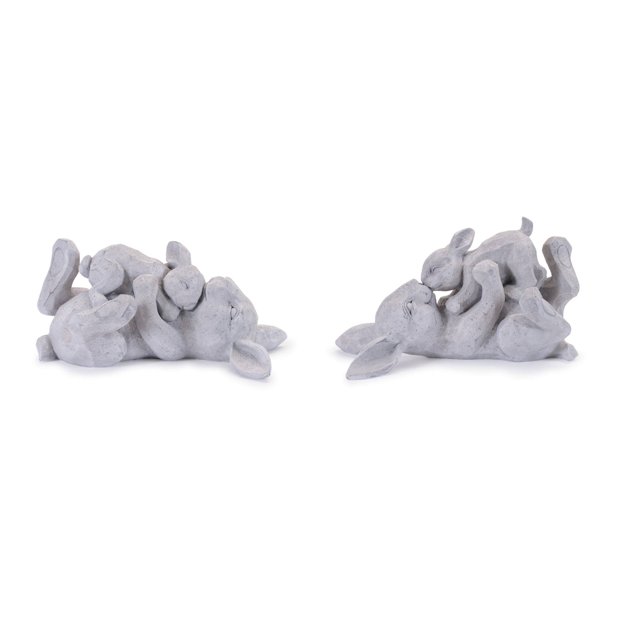 Bring a touch of warmth and charm to your home with this endearing set of two rabbit figurines. Featuring a sweet mother rabbit lying on her back and snuggling with her baby bunny, this set is crafted from durable polyresin in cool gray and white tones with a soft distressed finish. The adorable designs are perfect for adding a friendly, nature-inspired touch to any space, whether on bookshelves, tabletops, or mantelpieces.
