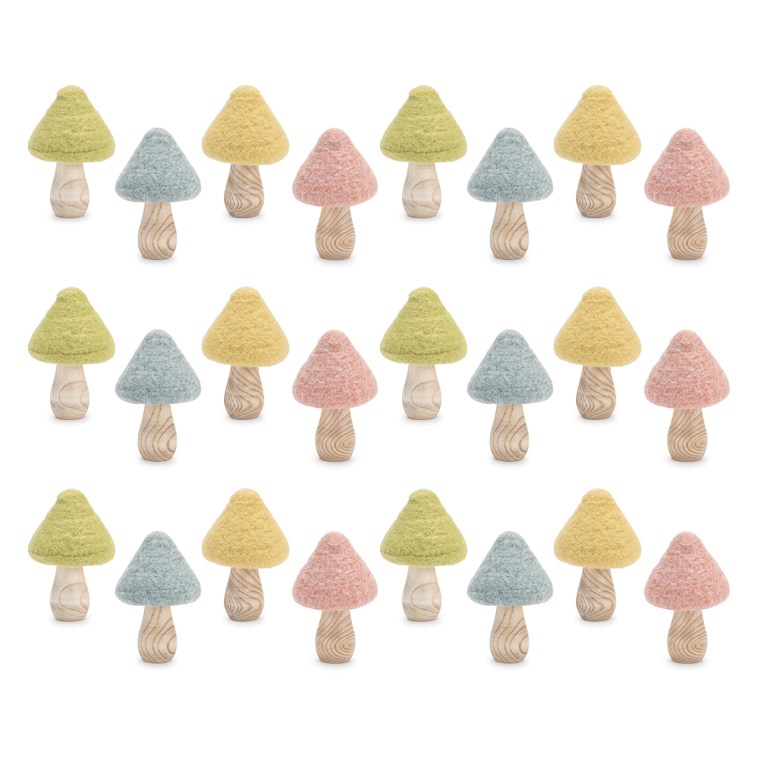 Bring a whimsical woodland charm into your home with this delightful Set of 24 Felt & Wood Mushroom Decorations. Each handcrafted piece features soft wool tops in pastel hues of green, pink, yellow, and blue, perfectly paired with sturdy natural wood stems. With four unique designs, these miniature mushrooms are ideal for springtime displays, fairy gardens, rustic centerpieces, or cottagecore decor. Whether you're styling a shelf or gifting a fellow nature-lover, this adorable set makes a magical statement year-round.