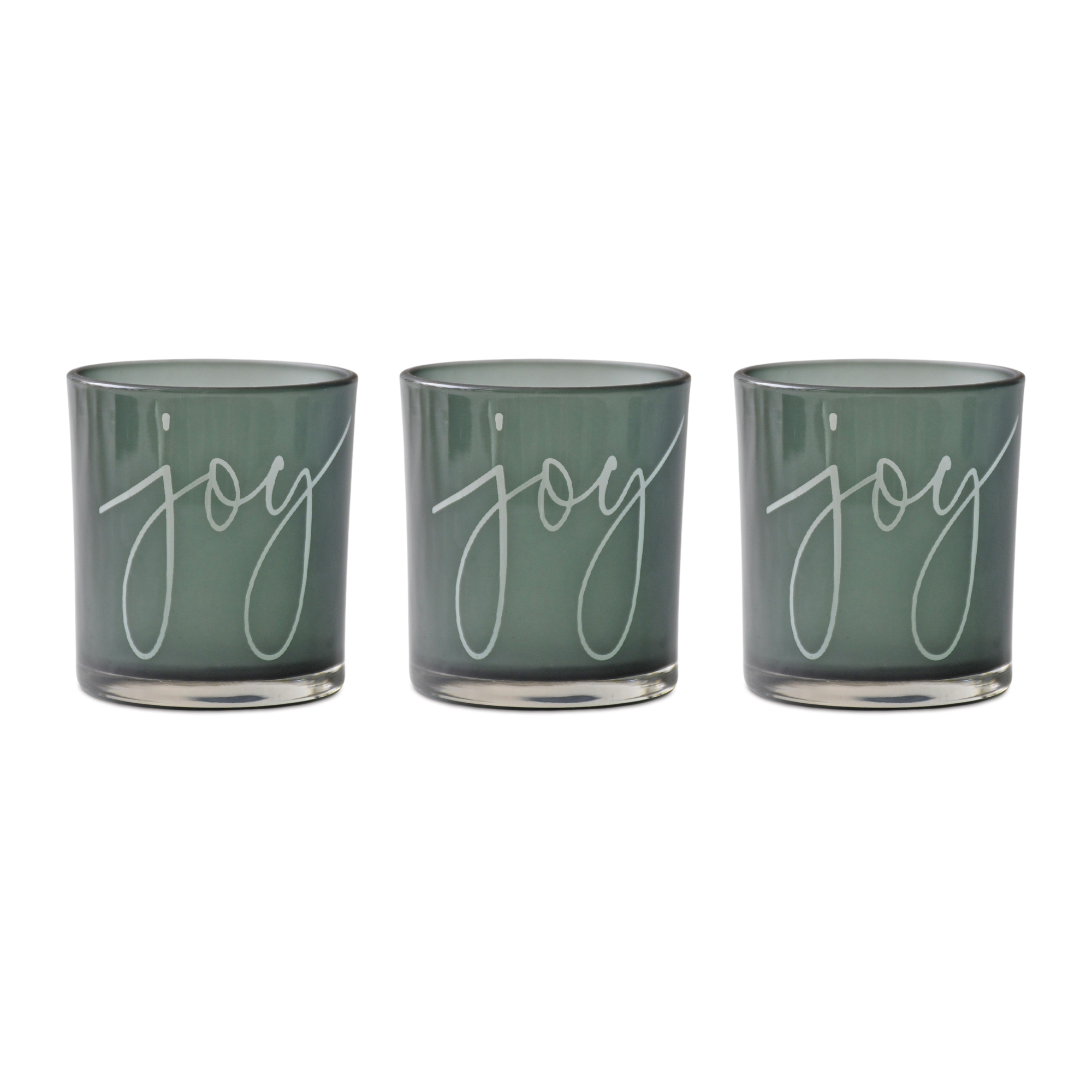 Illuminate your home this holiday season with this stunning set of Green Glass Candle Holders. Featuring three pieces, this set is a great fit for your modern or transitional style of holiday decor. The traditional "Joy" sentiment paired with the trendy sage green tone is the perfect combination to create a memorable display. The quality glass composition is sure to endure for seasons to come. Illuminate the set by adding a real wax or LED candle to each holder. Candles sold separately, this set best fits a 2" votive or tea light candle.