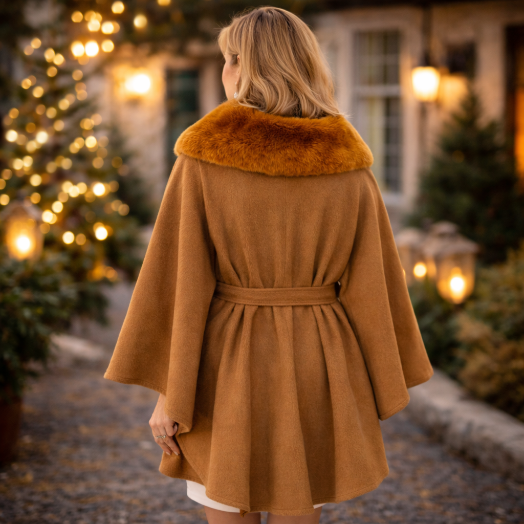Elevate your fall and winter wardrobe with this sophisticated belted cape coat in a rich camel tone. Designed with a dramatic faux fur collar and flowing silhouette, this piece offers timeless elegance for holiday events, winter weddings, evenings out, or upscale gatherings.