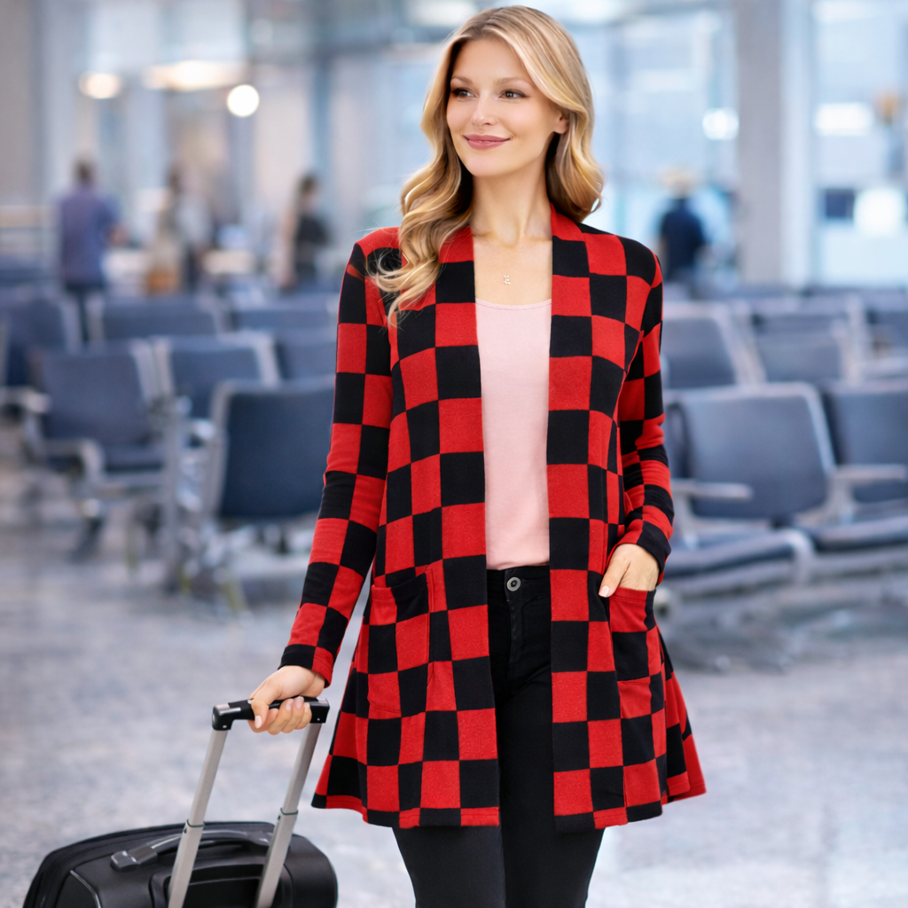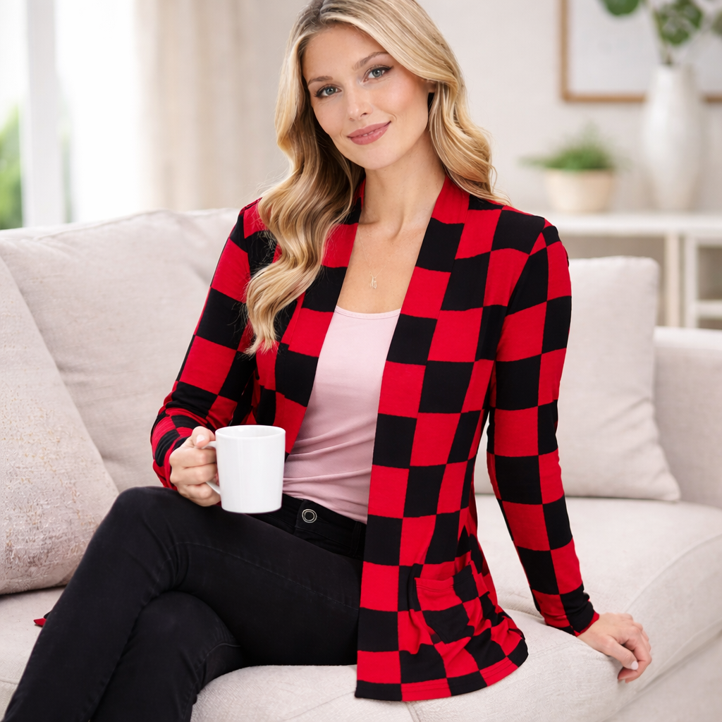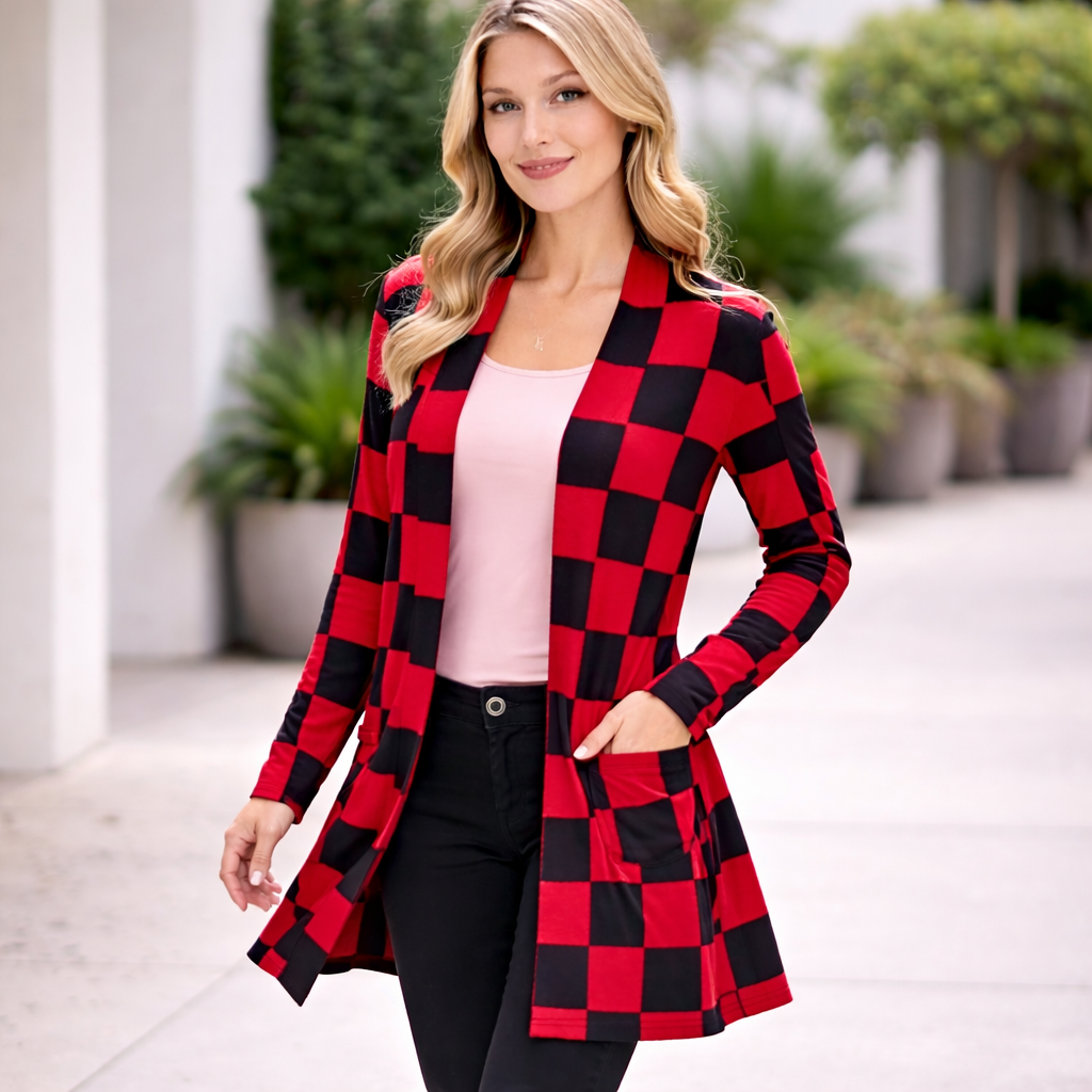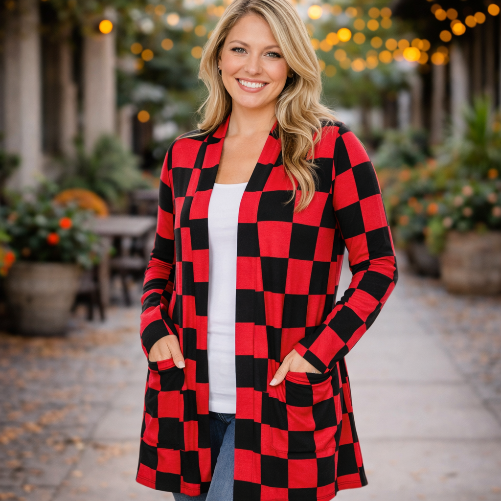 Long Checkered Cardigan,- Mid Thigh - Slouchy Pockets Ruby Red and Black