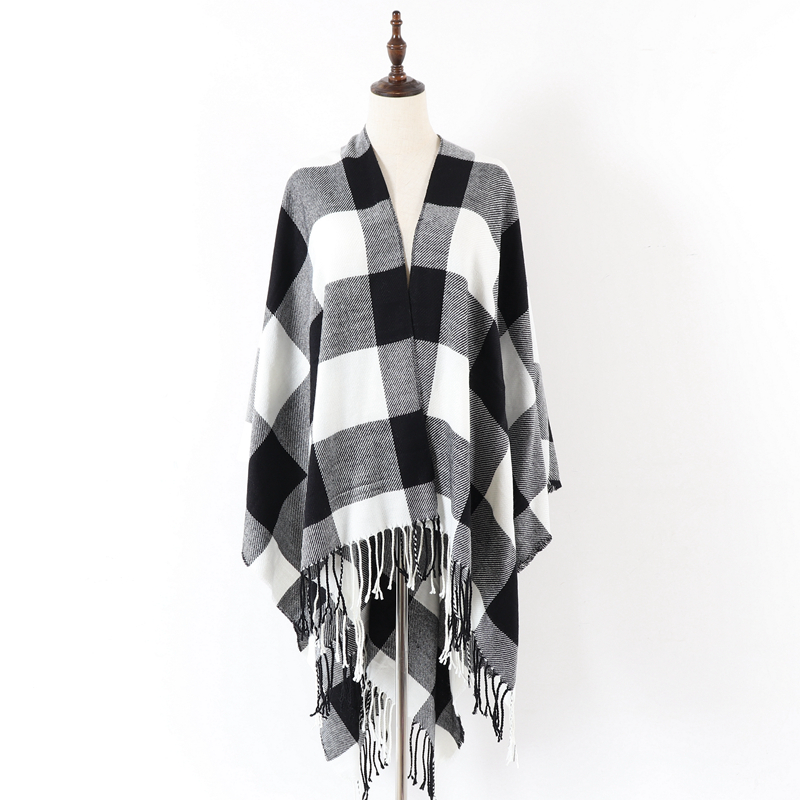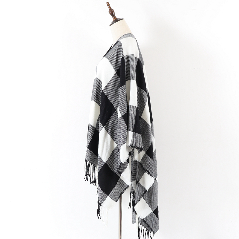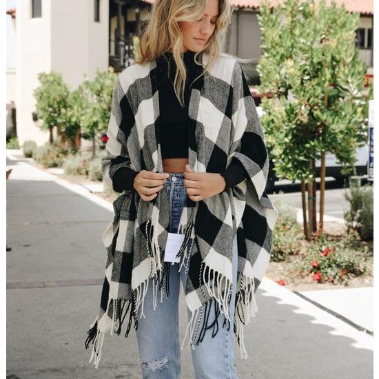 Plaid Buffalo Poncho Wrap Shawl, Black, White and Gray, Check pattern.