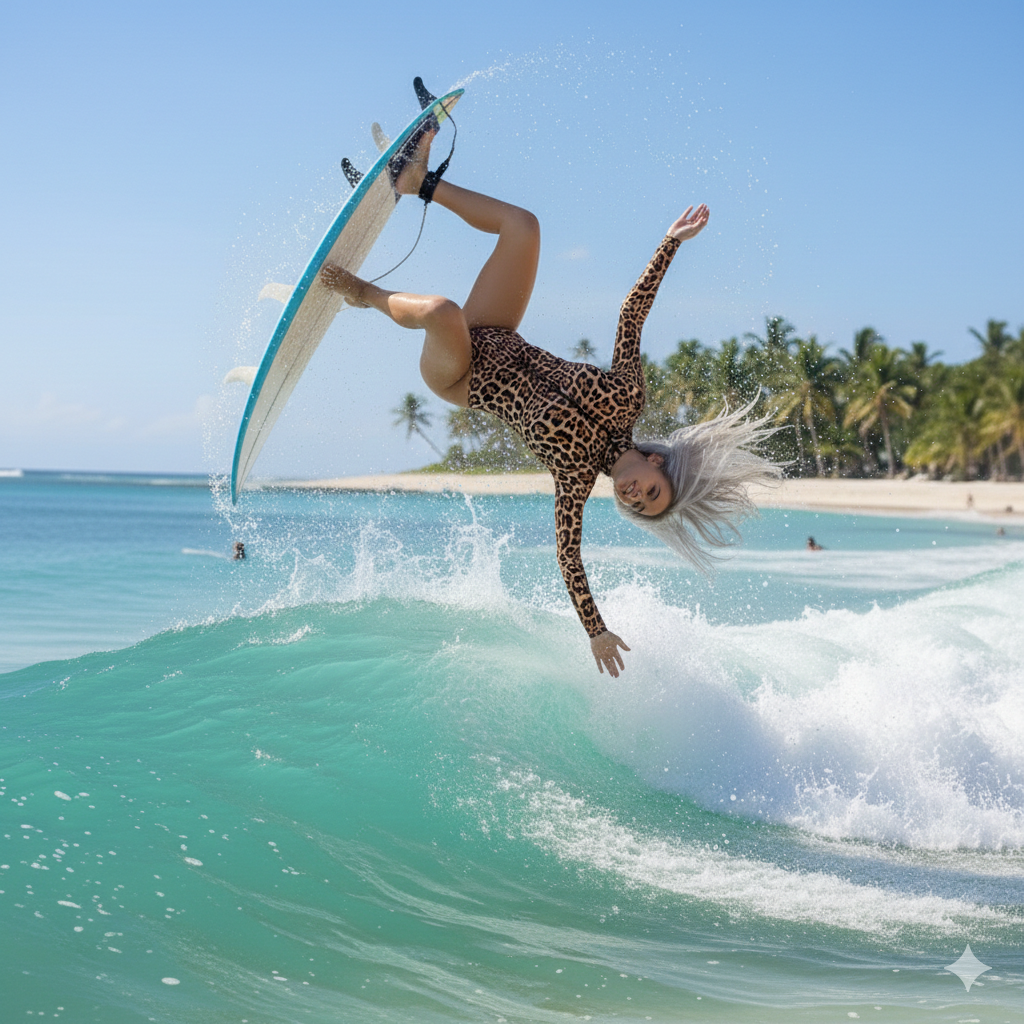 Leopard print surf suit featuring brown animal print, high neck, long sleeves, front zip fastening and stretch-design.