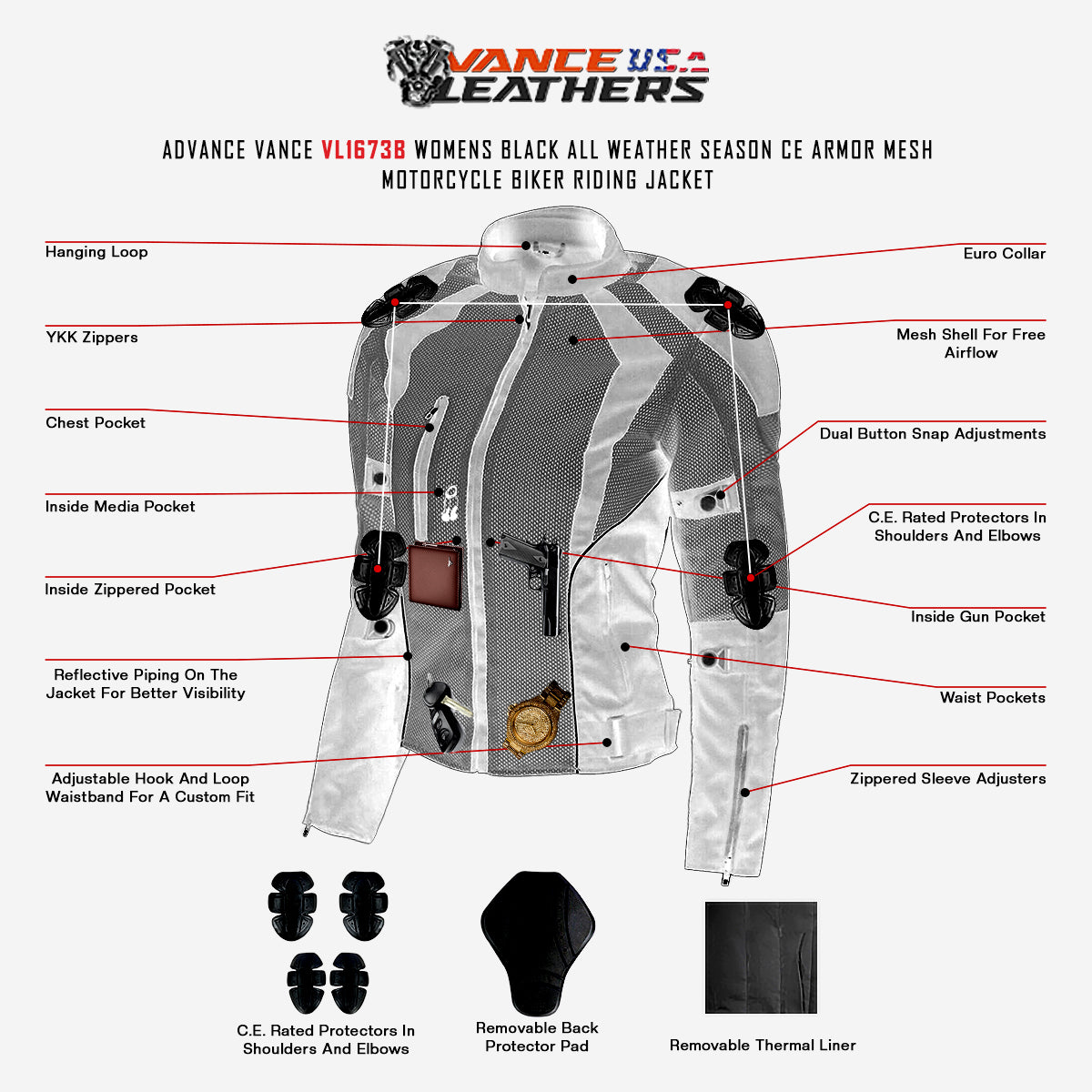 Womens Advanced 3-Season CE Armor Black Mesh Motorcycle Jacket.