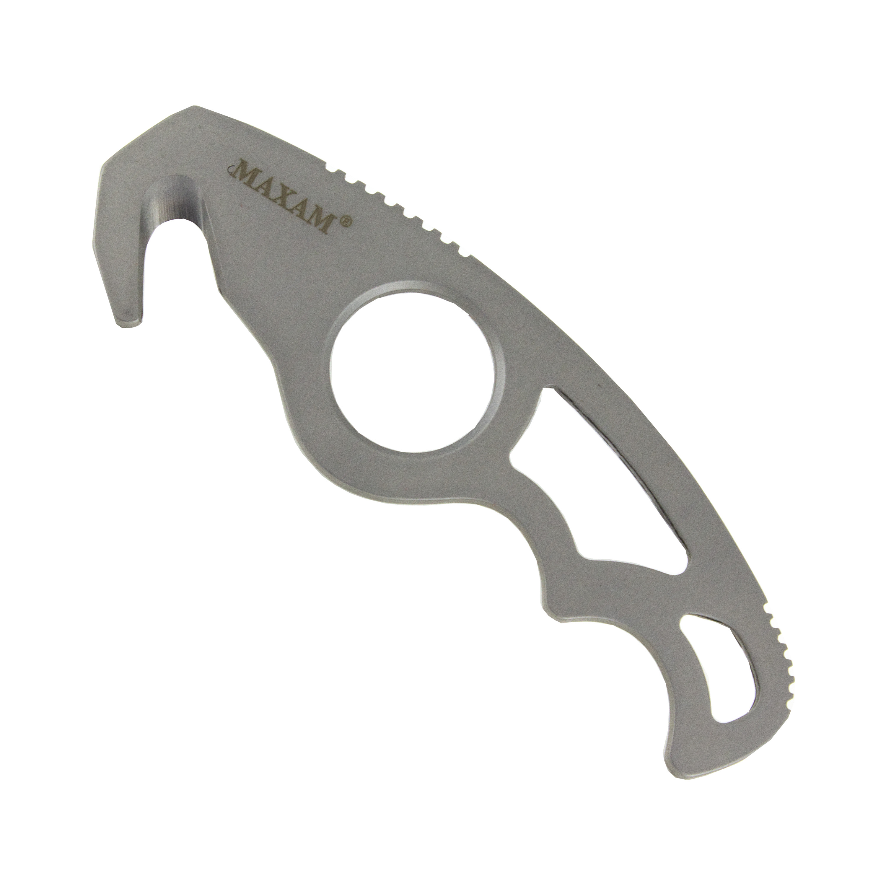 MAXAM® 5 Gut Hook. Features 8Cr18MoV blade with bead blast finish, 1680d nylon fabric sheath with MAXAM® woven label, black rivets, black snaps, PVC liners.