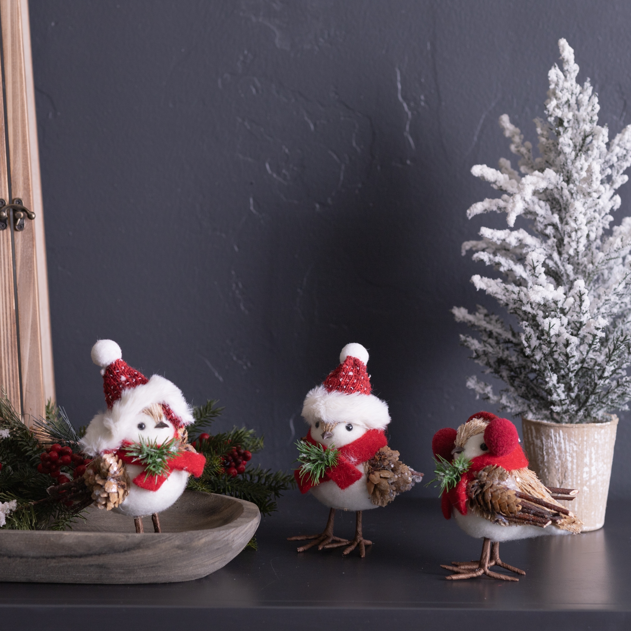 Embrace the winter season with the Winter Bird Shelf Sitters, a delightful set that brings a cozy woodland touch to your holiday decor. Crafted with a blend of foam, polyester, and real pinecones and twigs, each bird is uniquely designed with a charming hat and scarf, finished with a shimmering icy glitter. Perfect for rustic, woodland, or cabin-inspired decor, these Winter Birds add a natural, festive vibe to your home, bringing warmth and cheer. Durable and timeless, they're sure to be a beloved part of your holiday display for seasons to come. Sold in a set of twelve pieces with three assorted designs to make a statement in your holiday displays.