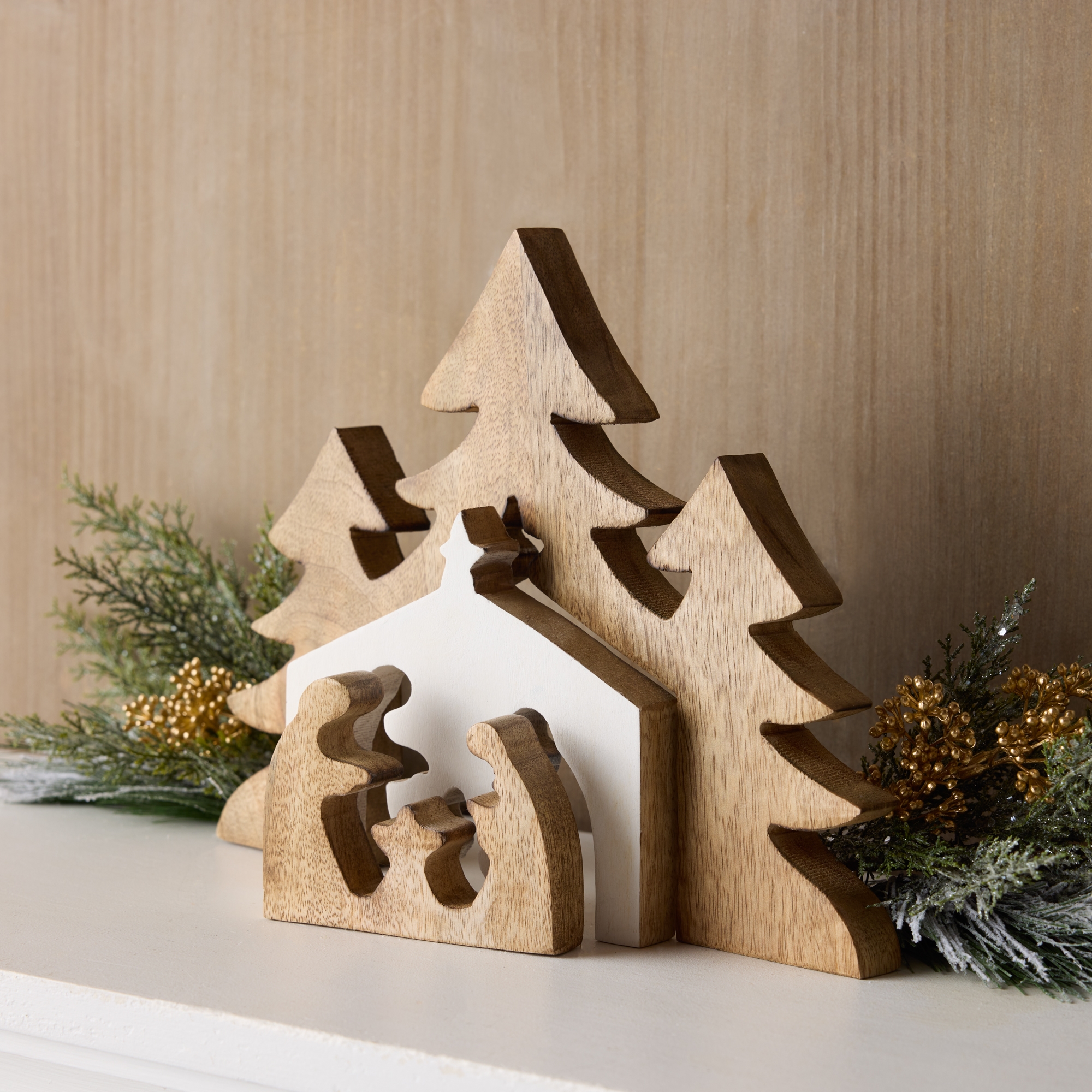Bring warmth and holiday spirit to your home with the charming Nesting Wood Nativity Display. This beautifully crafted, 3-piece nested puzzle showcases a classic nativity scene accented by pine trees, creating a nostalgic winter display. Made from durable mango wood with a natural wood grain finish, this decor piece adds rustic elegance to any room. Perfect for your mantle, bookshelf, or as a thoughtful gift, this timeless display will enhance your seasonal decor for years to come.