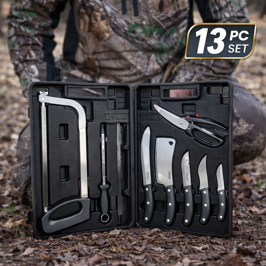 The Maxam 13pc Game Processing Set features full tang stainless steel blades so you'll never find yourself in a bind when its time to process what you've bagged hunting. Triple-rivet Leymar handles for a comfortable, safe grip. Kit Includes 10" shears, a hacksaw with 4 stainless steel saw blades, a sharpening steel, 13-1/2" cleaver, 11-1/2" butcher knife, 9-1/2" skinning knife with gut hook, 8-1/4" caping knife, and a 7" paring knife.