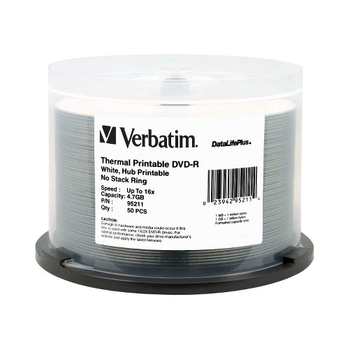 Verbatim 95211 50PK DVD-R 16X 4.7GB WHITE THERMAL HUB PRINTABLE SPINDLE