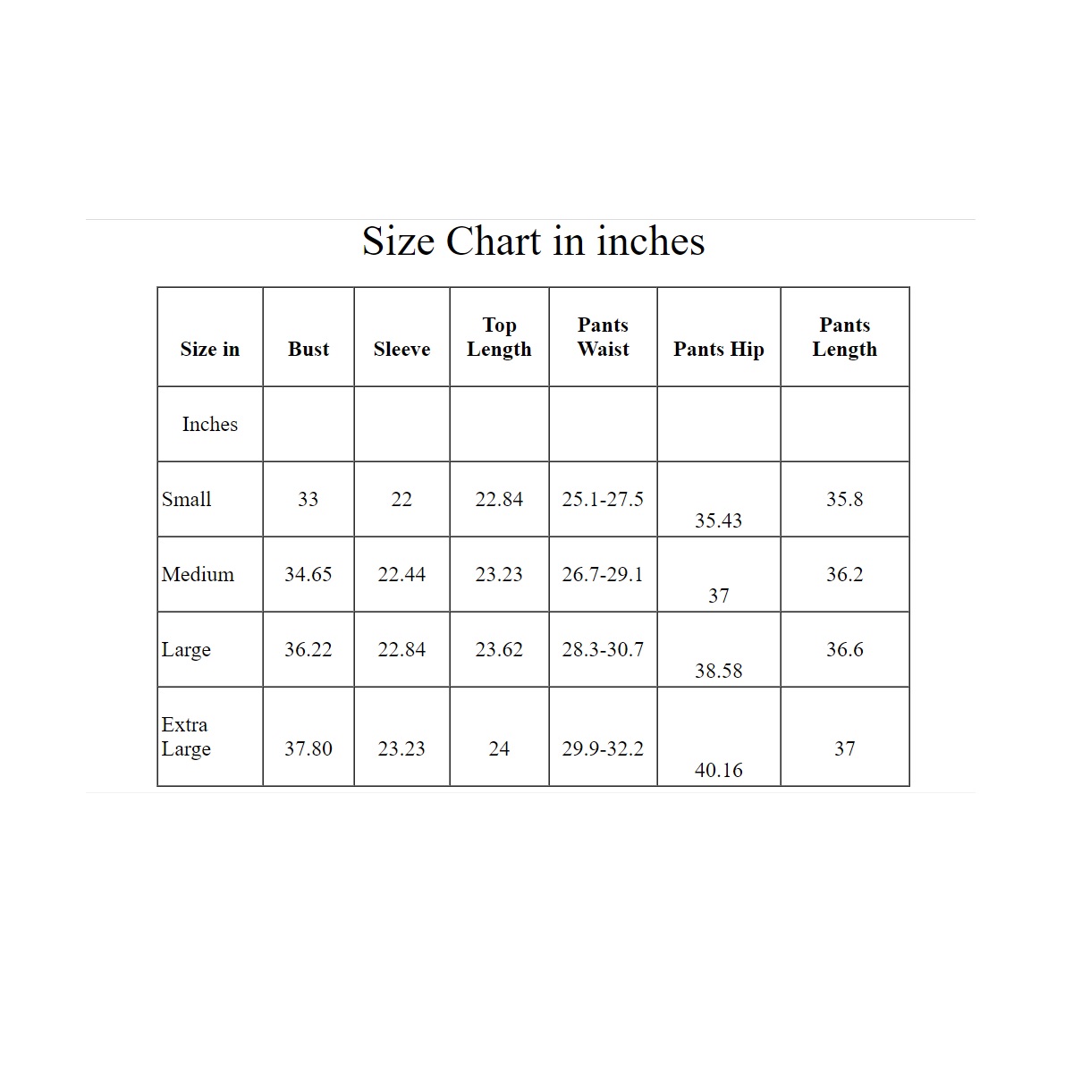 | Size in | Bust | Sleeve | Top Length | Pants Waist | Pants Hip | Pants Length |