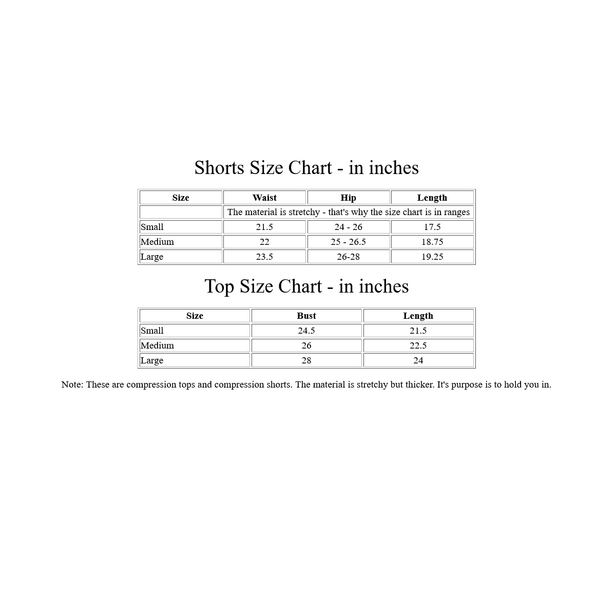Note: These are compression tops and compression shorts. The material is stretchy but thicker. It's purpose is to hold you in.