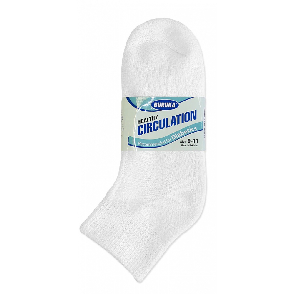 Diabetic Socks for women - soft and comfortableNon-Binding loose fitting top allows for optimal circulatory flow Full cushion lining with heel and toe support for pressure relief and maximum foot protection Soft Cushioned Sole Smooth Toe Seam Delicate cotton blend for extra comfort 88% cotton, 10% nylon, 2% elastic Size 9-11 Pack of 3 - you get 3 pairs of white diabetic socks |