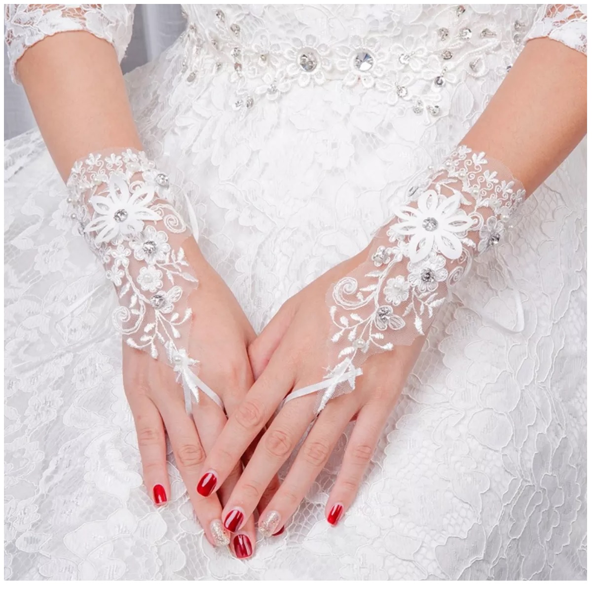 Floral Lace Gloves studded with glittering crystals