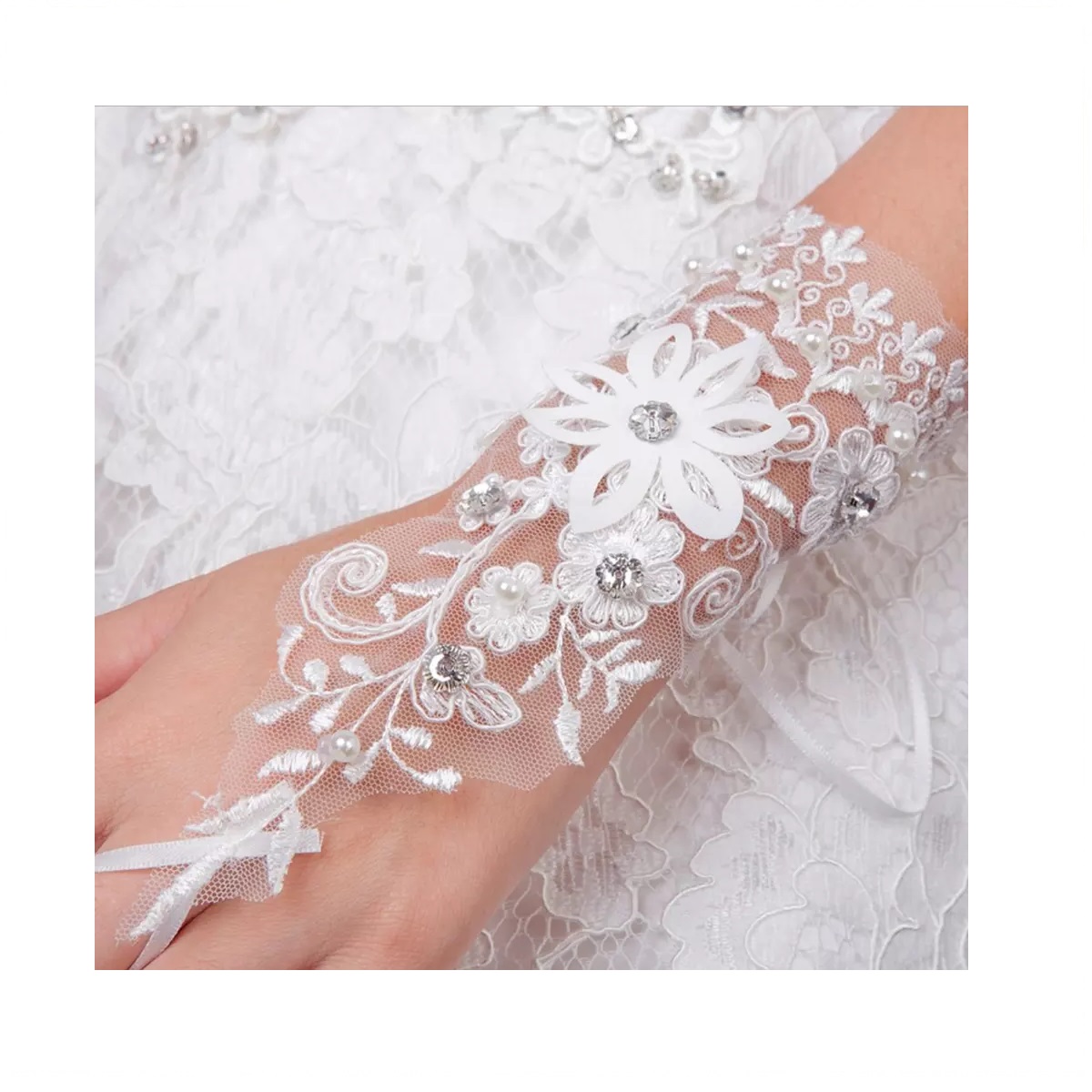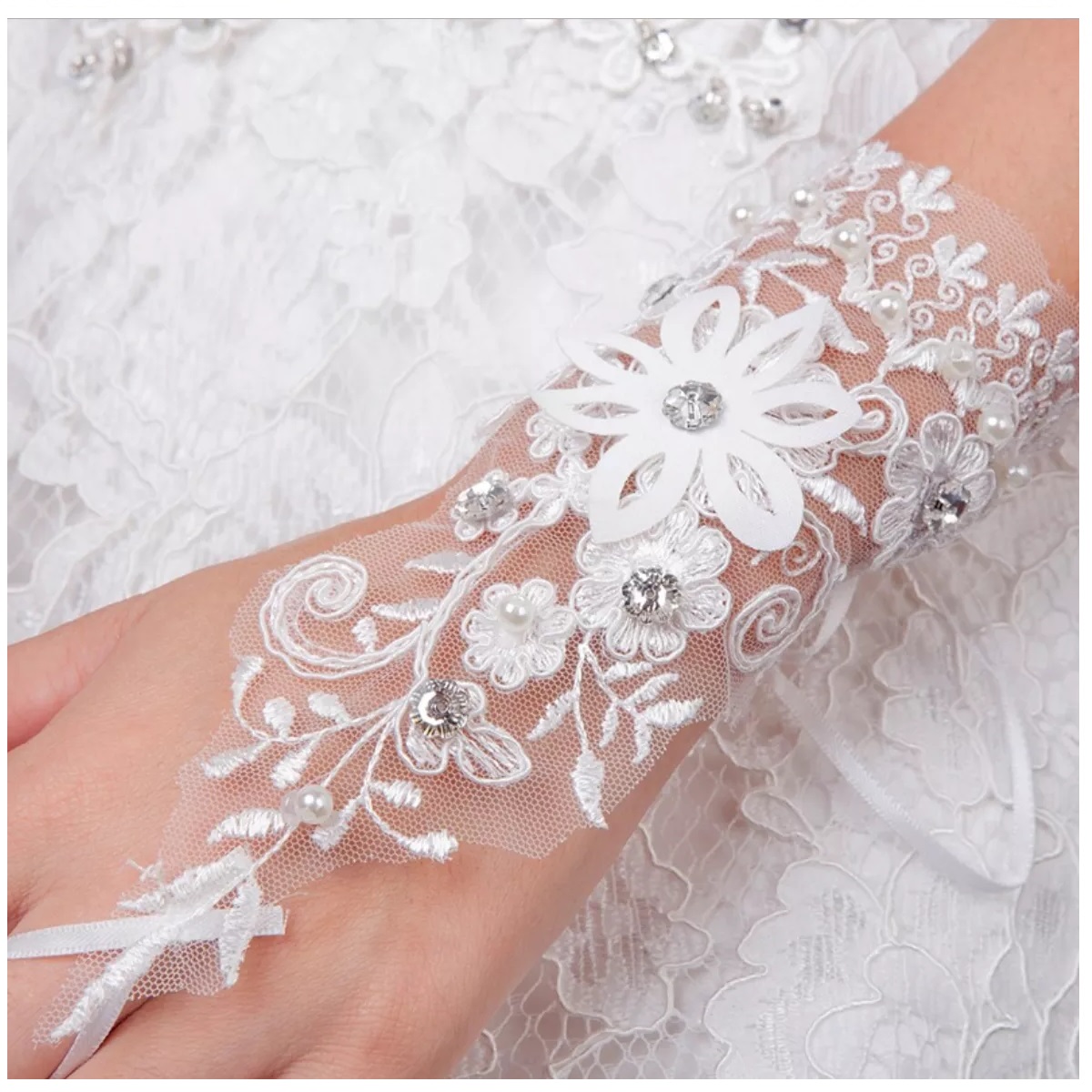 Embroidered Satin & Lace Bridal Gloves White Floral Lace Gloves studded with glittering crystals