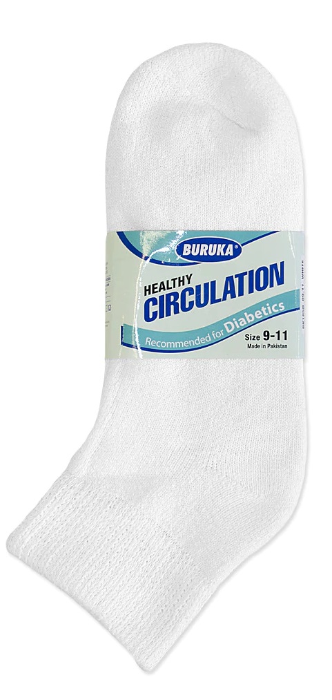 Diabetic Socks for women - soft and comfortableNon-Binding loose fitting top allows for optimal circulatory flow Full cushion lining with heel and toe support for pressure relief and maximum foot protection Soft Cushioned Sole Smooth Toe Seam Delicate cotton blend for extra comfort 88% cotton, 10% nylon, 2% elastic Size 9-11 Pack of 3 - you get 3 pairs of white diabetic socks |