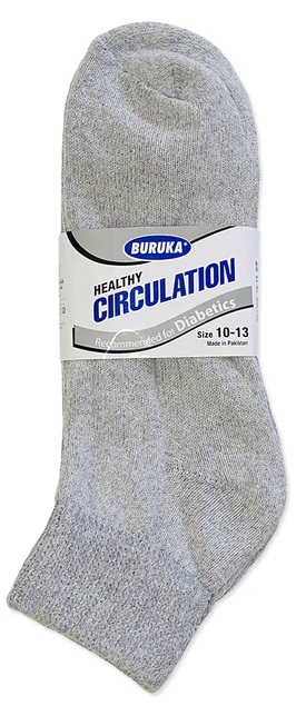 Diabetic Socks for women - soft and comfortableNon-Binding loose fitting top allows for optimal circulatory flow Full cushion lining with heel and toe support for pressure relief and maximum foot protection Soft Cushioned Sole Smooth Toe Seam Delicate cotton blend for extra comfort 88% cotton, 10% nylon, 2% elastic Size 9-11 Pack of 3 - you get 3 pairs of Gray diabetic socks |