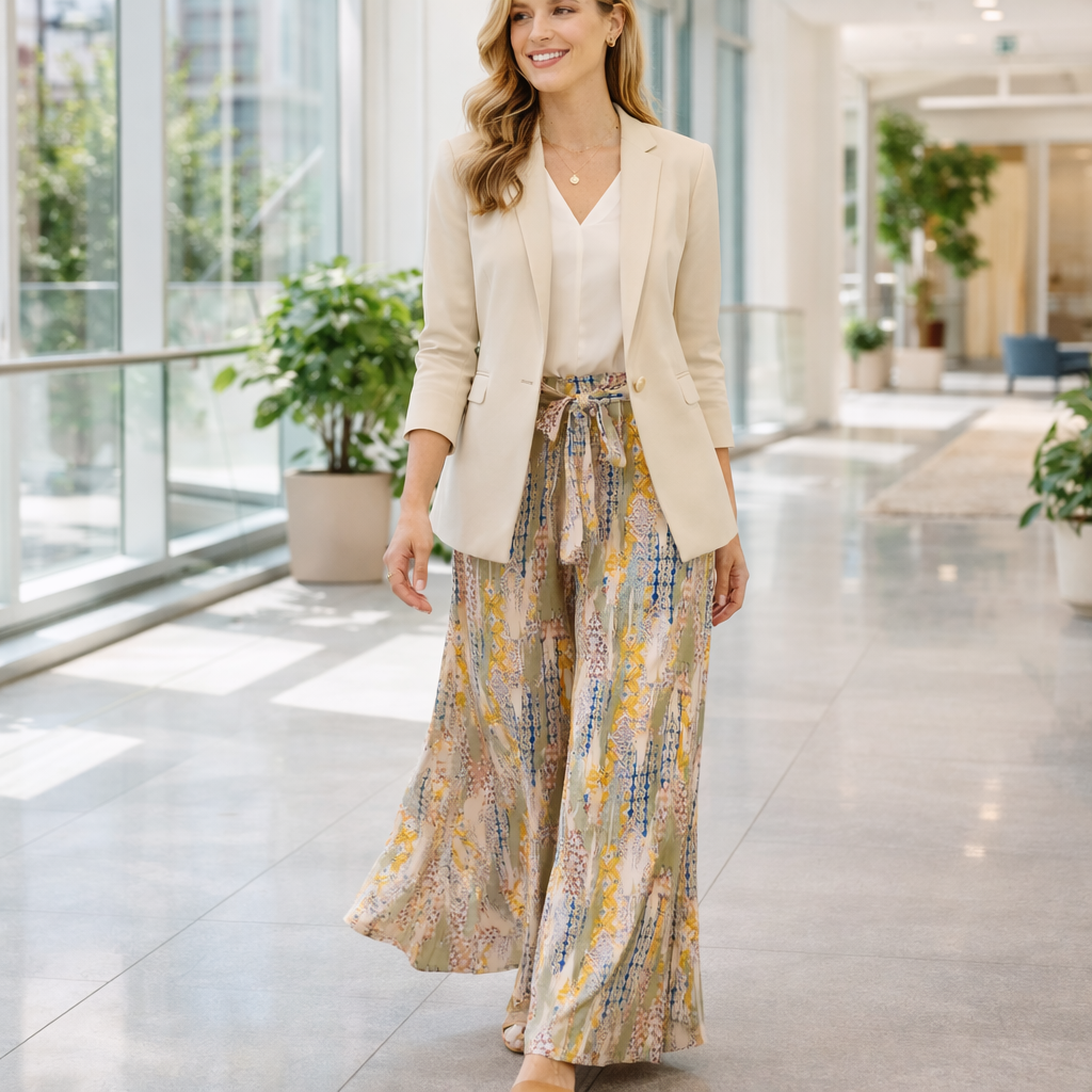 These printed palazzo pants blend a relaxed boho vibe with a polished silhouette you can style for weekend casual or a creative office look. The flowing wide-leg cut moves beautifully, while the front tie waist flatters and adjusts for comfort.