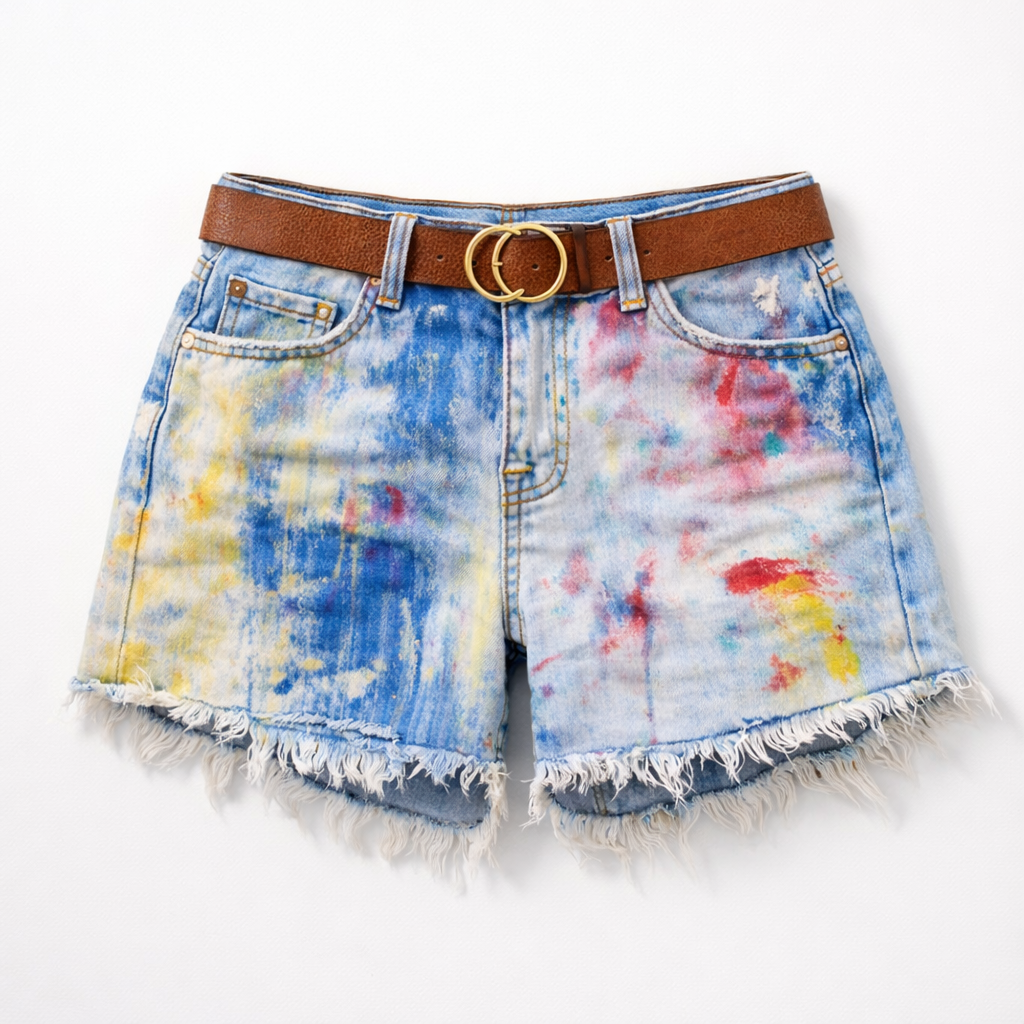 Make a statement in these bold painted distressed denim shorts crafted from premium fabric sourced in Colombia — a country known for quality denim production.