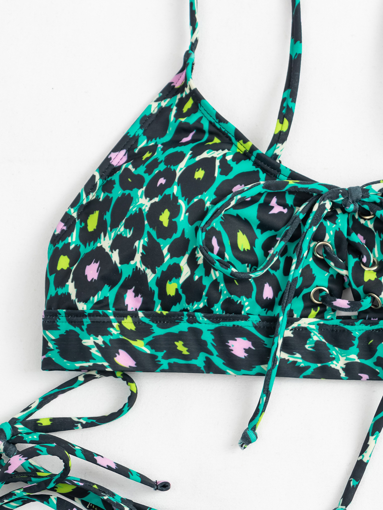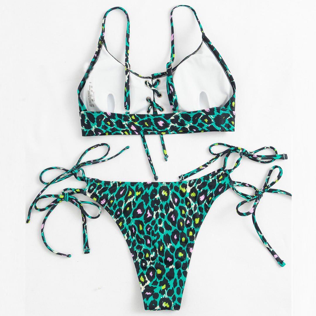 Leopard print string bikini set featuring turquoise animal print with side string.