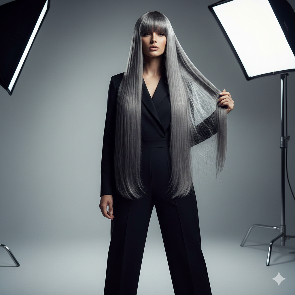 Achieve a bold, trendy look with our Premium Ash Gray Hip-Length Wig. This silky straight wig features a natural-cut fringe (bangs) and a stunning cool-toned gray shade that complements all skin tones. Perfect for cosplay, fashion events, or a total style transformation.