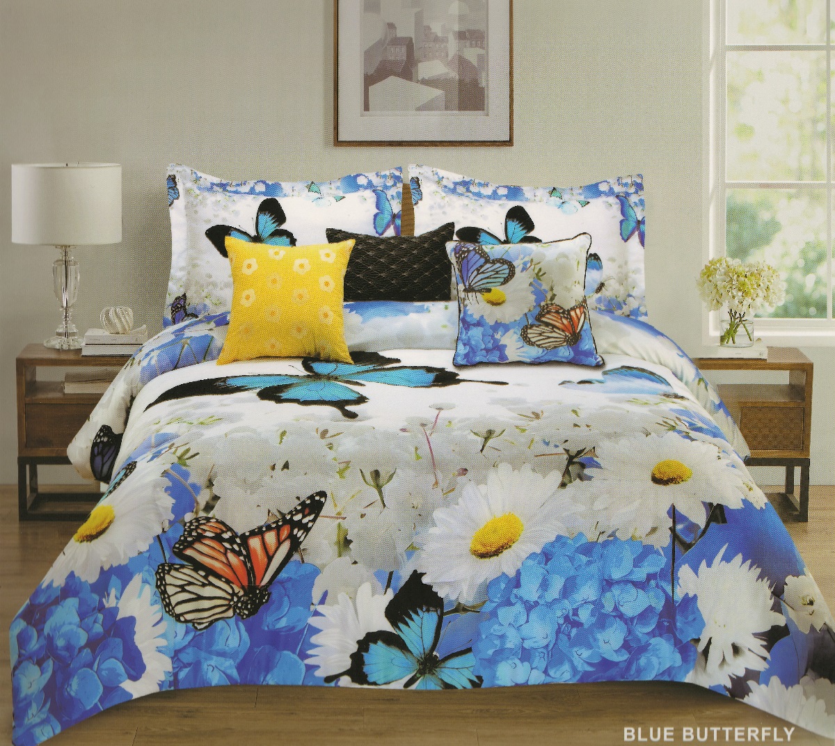 Blue Butterflies Comforter SetUltra Soft and Cozy: Our Premium comforters are everything you need for a dreamy night’s sleep. With a luxurious breathable Microfiber filling, it is truly for all seasons. Enjoy feeling warm and snug on a chilly evening while still feeling just right the rest of the year. Durable - The patterned comforter is highly durable with a high tensile strength, making it strong and less likely to rip or tear. 100% microfiber, soft, durable, lightweight, fade-resistant, wrinkle-resistant, hypoallergenic and machine washable. Design: Floral with butterflies Color: Blue is the dominant color Sizes: Queen Size 7 piece set Dimensions: