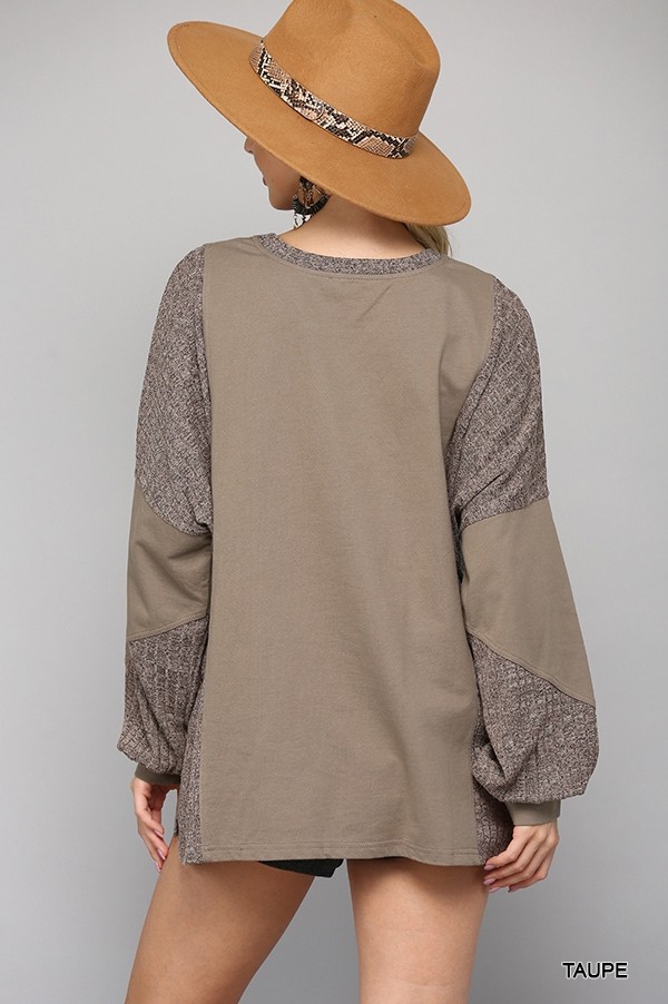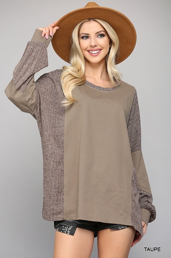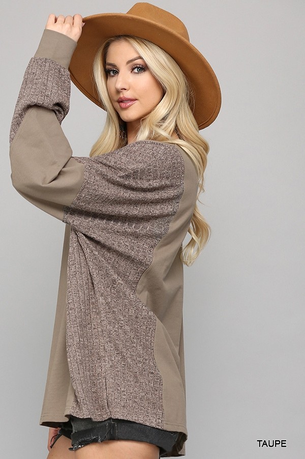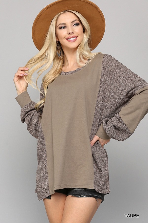 Two Tone Top with Dolman Sleeve Solid Terry & Rib Knit Mix Top - Taupe