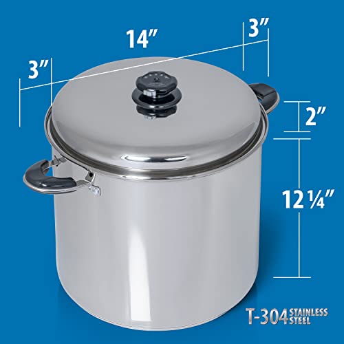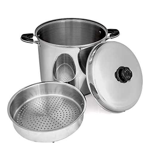 Made of T304 stainless steel, this highly polished large stock pot lets you steam cook with minimum water. Let food start to cook on medium heat, then, when the valve starts to whistle, push the lever until the word CLOSED appears. Turn the heat down to low and let the cooking process continue. This will help retain taste and valuable nutrients. This also eliminates the need for grease or oil in cooking. The steamer basket will hold a colorful bouquet of vegetables or fish for steaming. Handles are riveted. Limited lifetime warranty. White box.