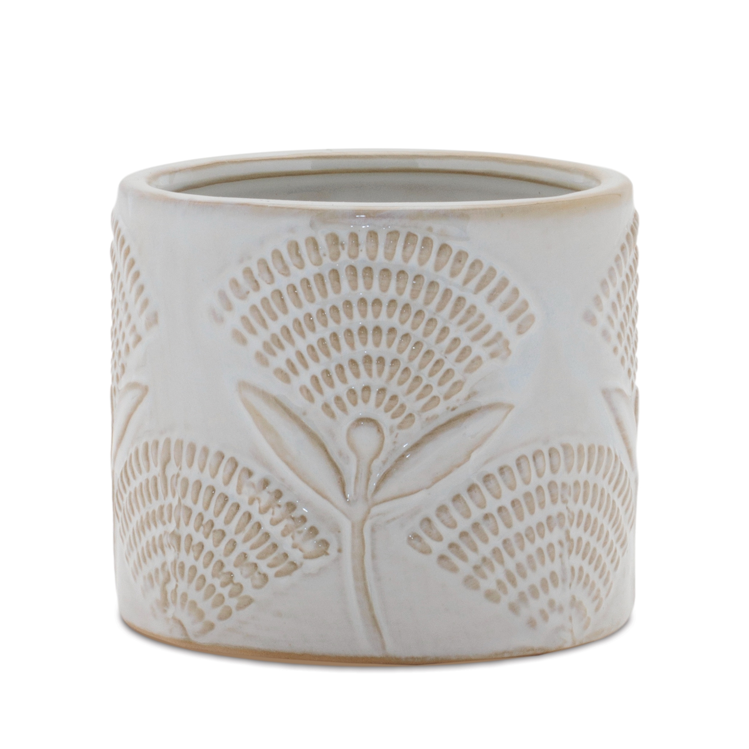 Add a touch of elegance to your space with the Porcelain Floral Patterned Planter Set. Featuring cool beige and white tones, these planters showcase a beautiful floral etched texture that enhances their sophisticated appeal. Finished with a glazed coating, these planters have a sleek, polished look. Sold in a set of two assorted sizes, they are perfect for displaying both real and faux plants, making them versatile for various decorating styles. These planters are suitable for use in indoor or outdoor covered areas.