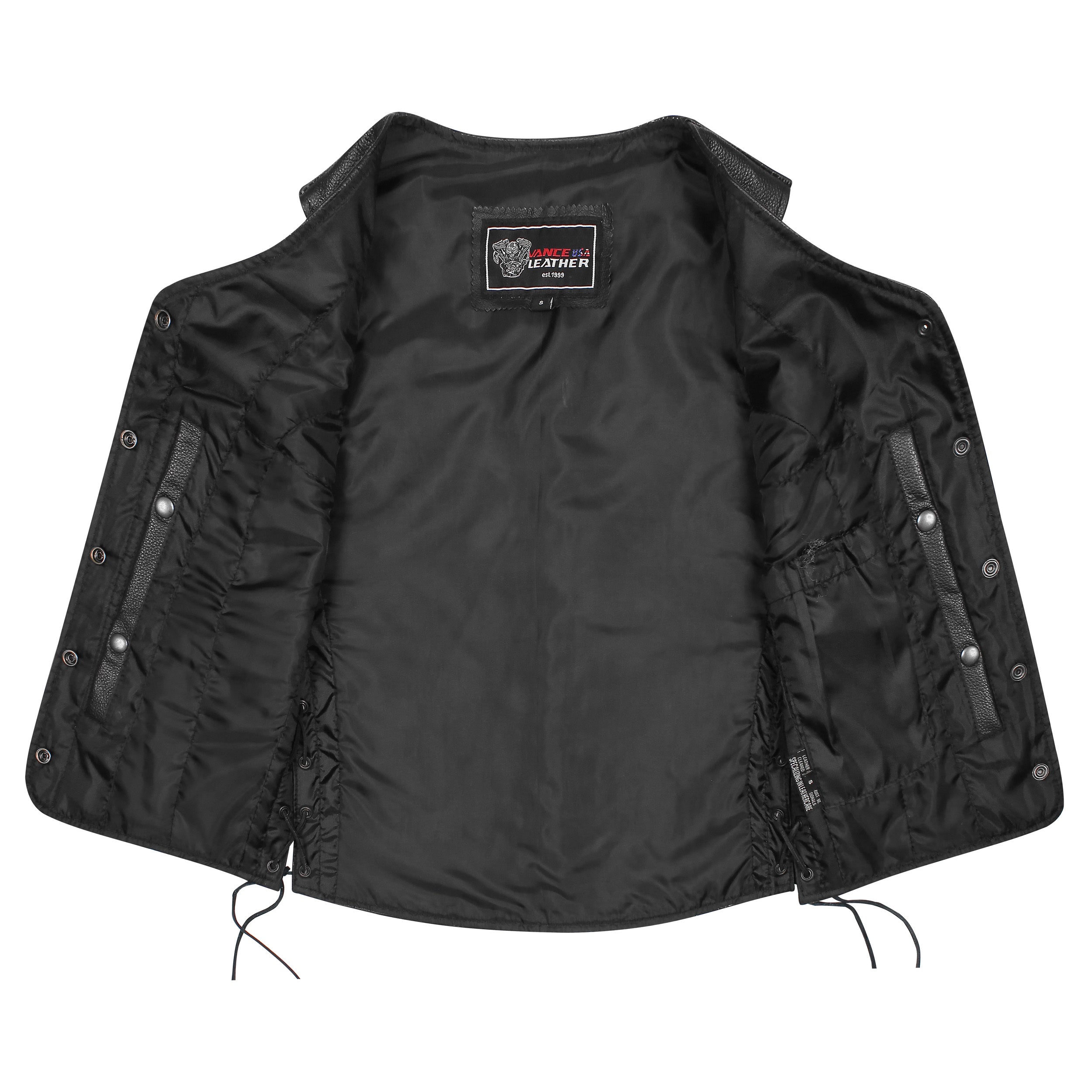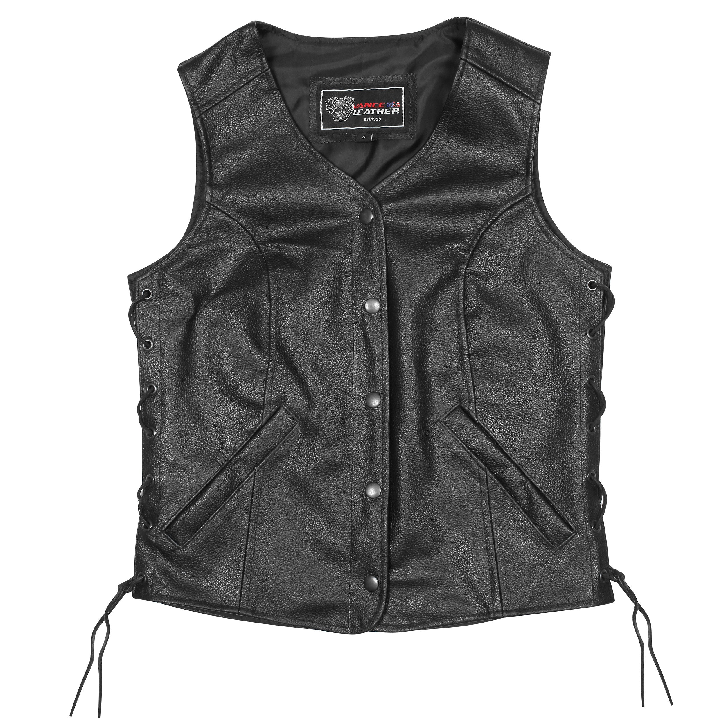 The Women's Five Snap Side Laced leather vest is a simple vest that is perfect for the lady who wants a streamline look. This vest has a great fit with side laces to contour the female body just right.