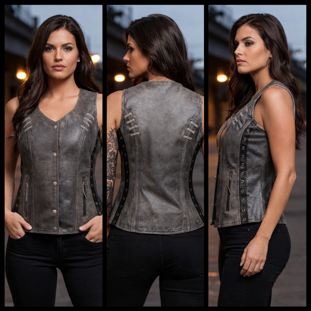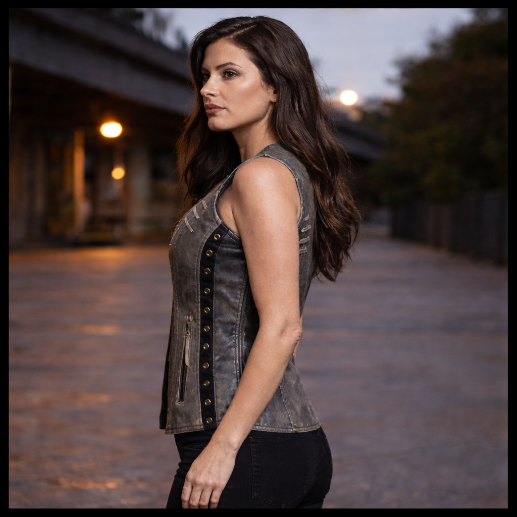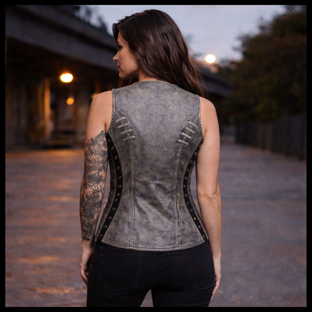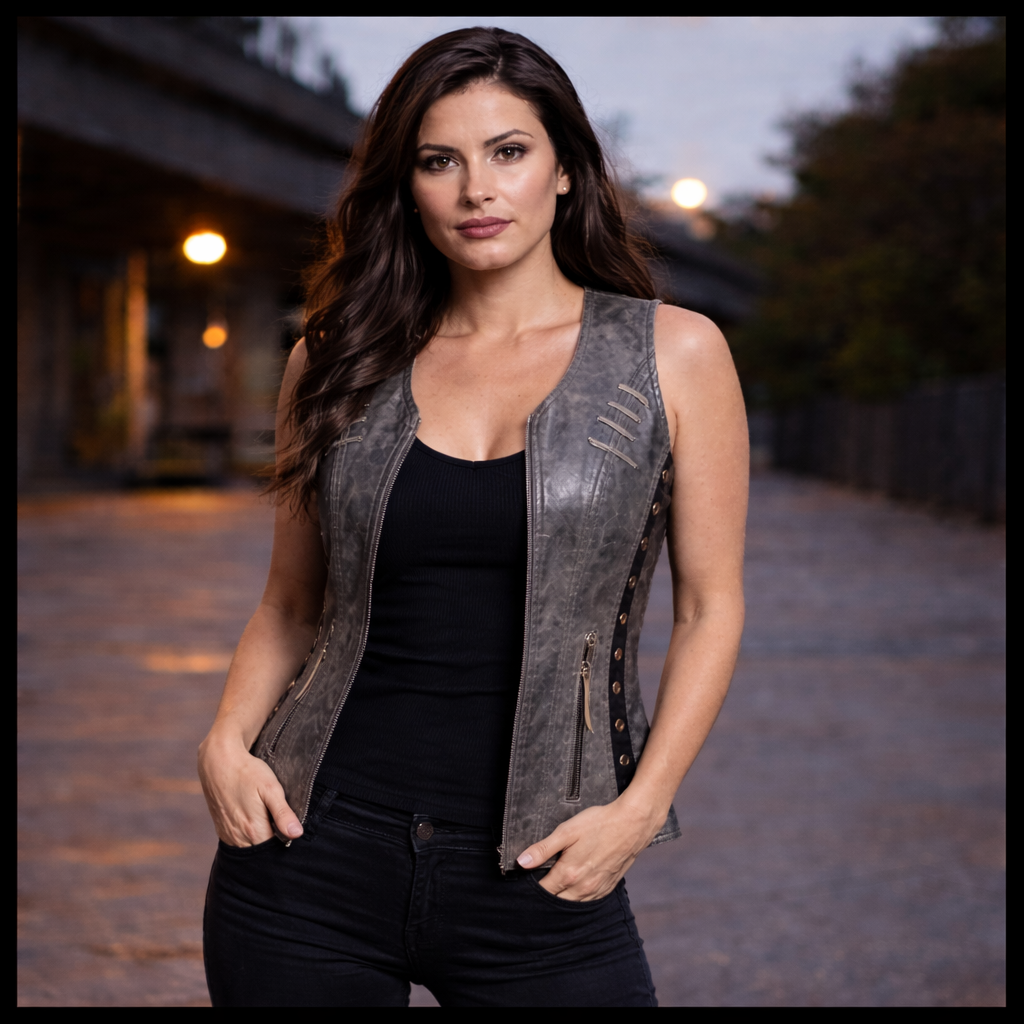 If you want a truly feminine look then try on the ladies lightweight naked goatskin leather vest in a distressed gray color. The vest is accented with black stitching which offsets the grommet details and lace accents. There is plenty of room for those little knick-knacks that the ladies love to carry. Also, this vest comes equipped with a gun pocket with elastic gun and ammunition fittings so she can step out well-protected and no one will be the wiser.