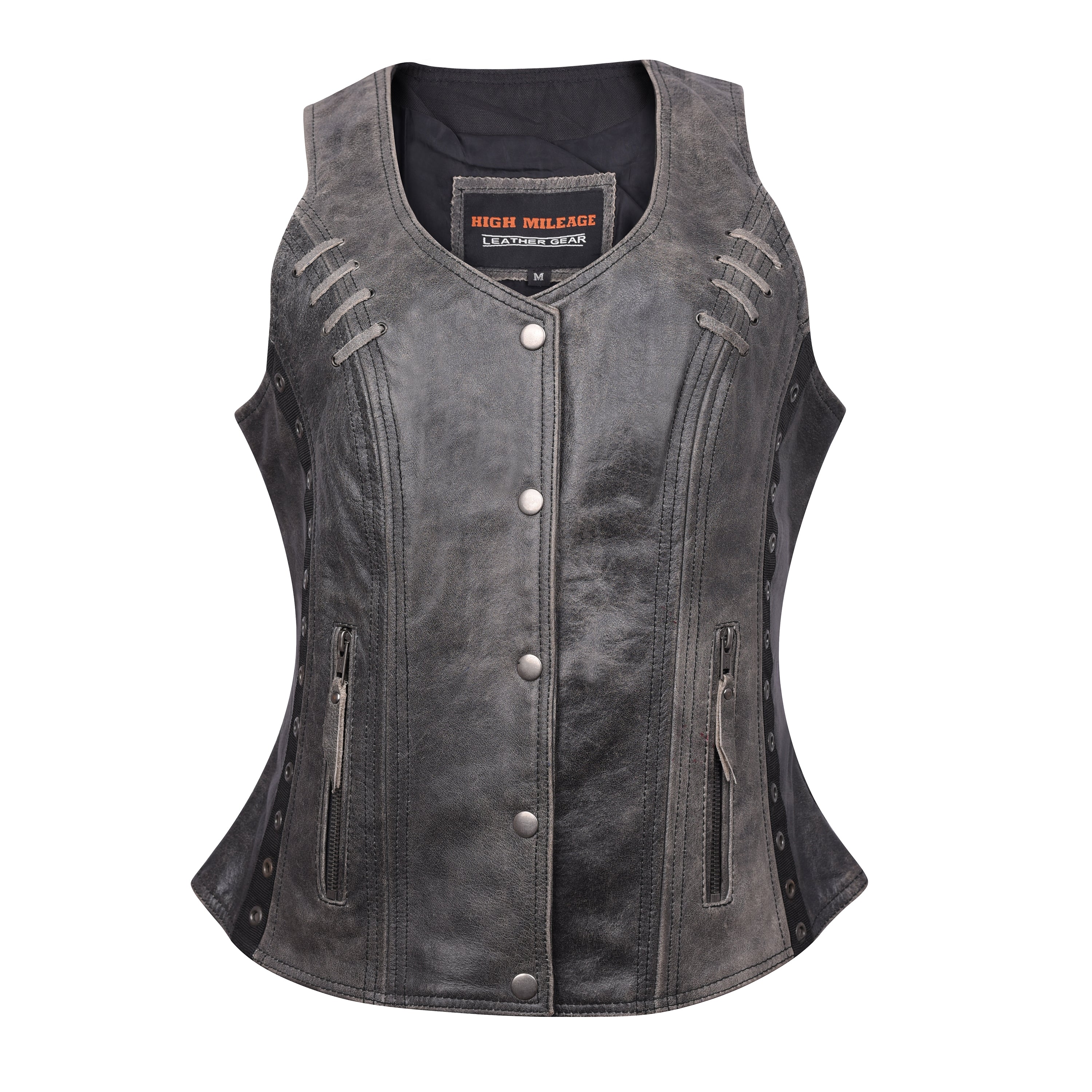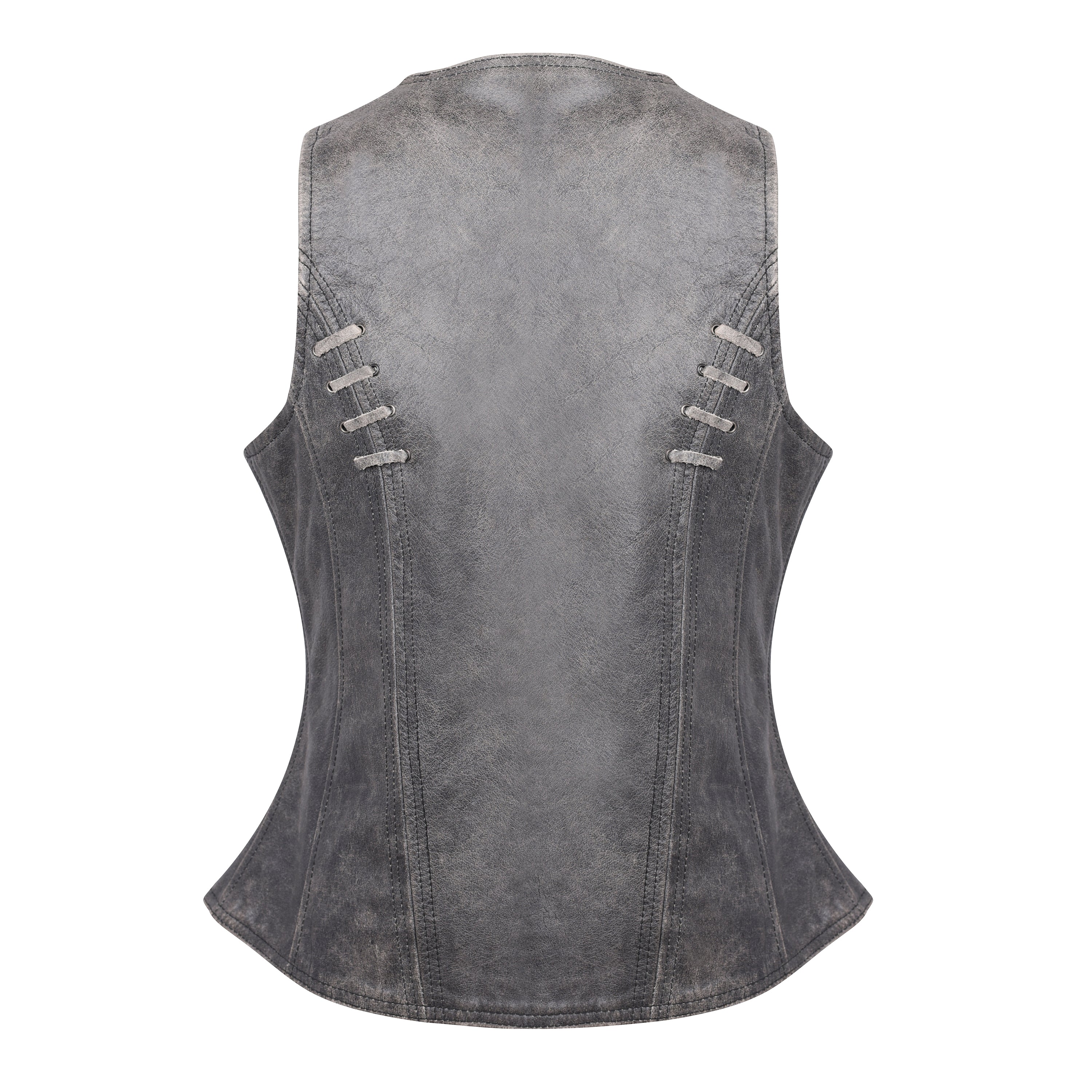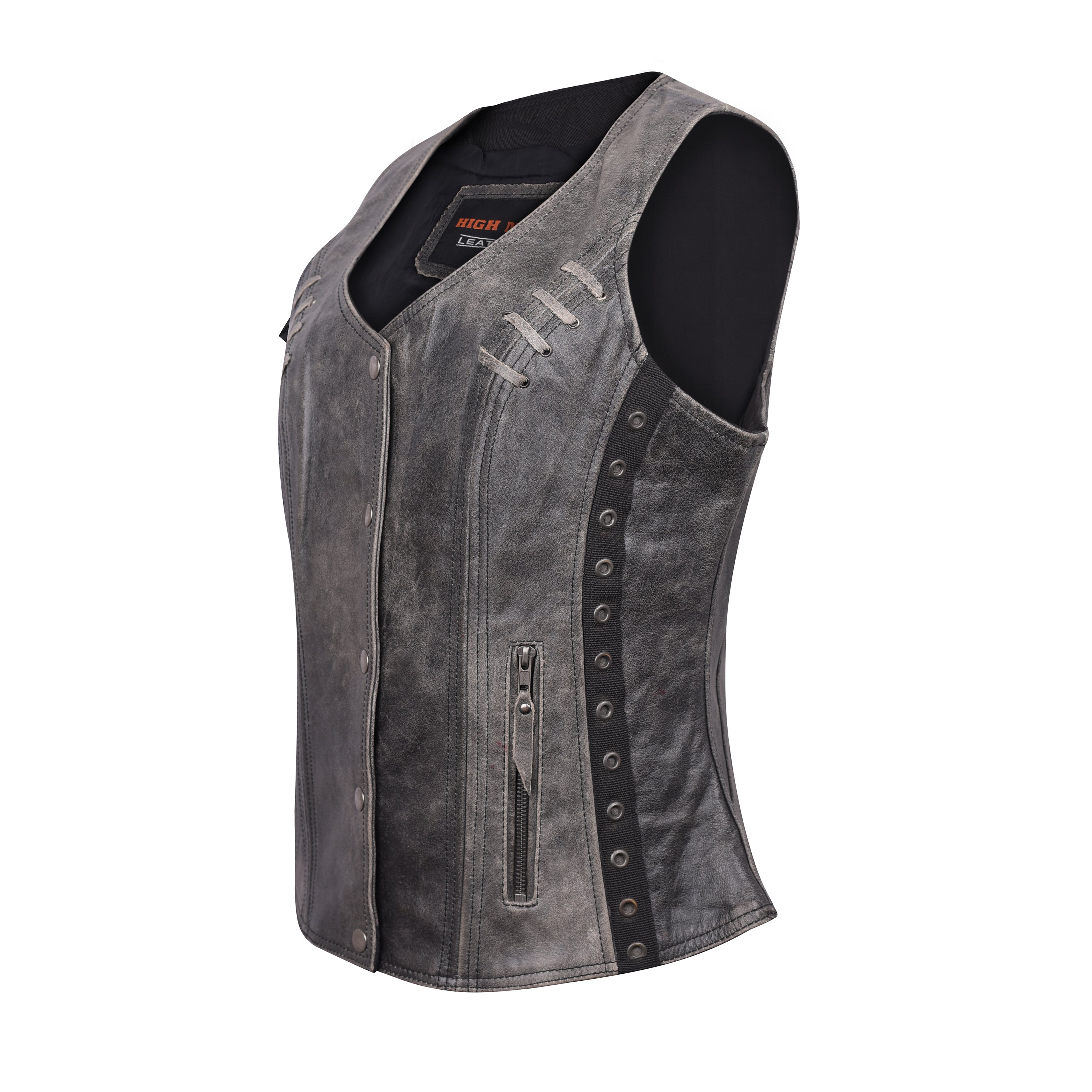 If you want a truly feminine look then try on the ladies lightweight naked goatskin leather vest in a distressed gray color. The vest is accented with black stitching which offsets the grommet details and lace accents. There is plenty of room for those little knick-knacks that the ladies love to carry. Also, this vest comes equipped with a gun pocket with elastic gun and ammunition fittings so she can step out well-protected and no one will be the wiser.