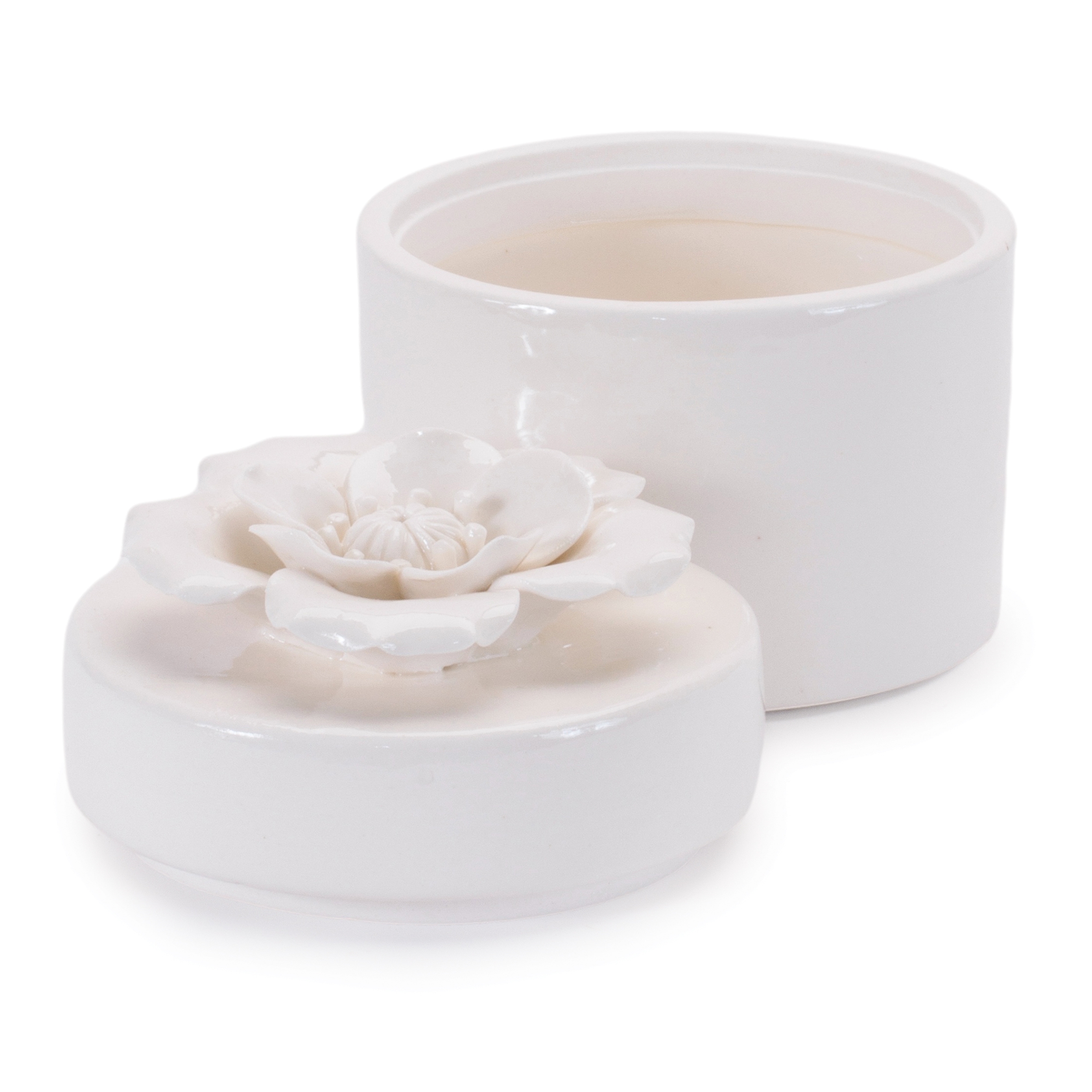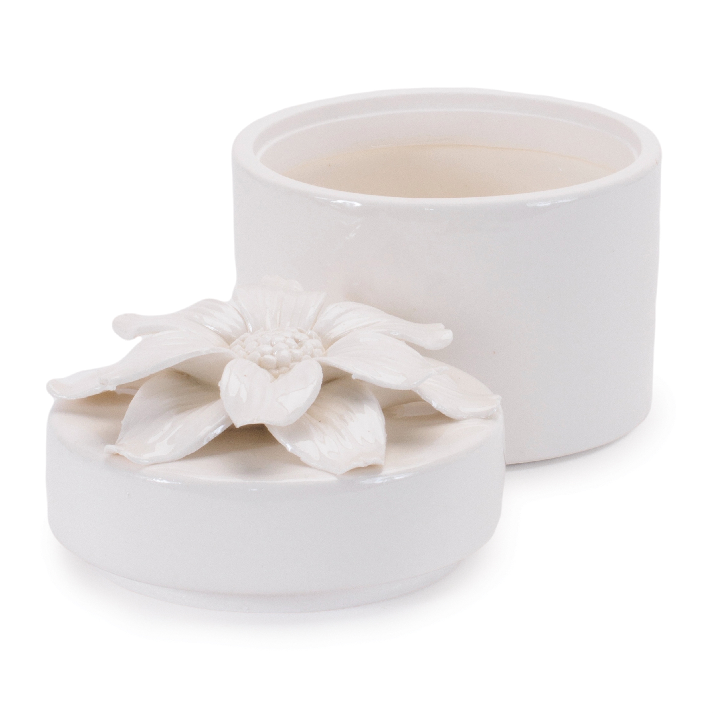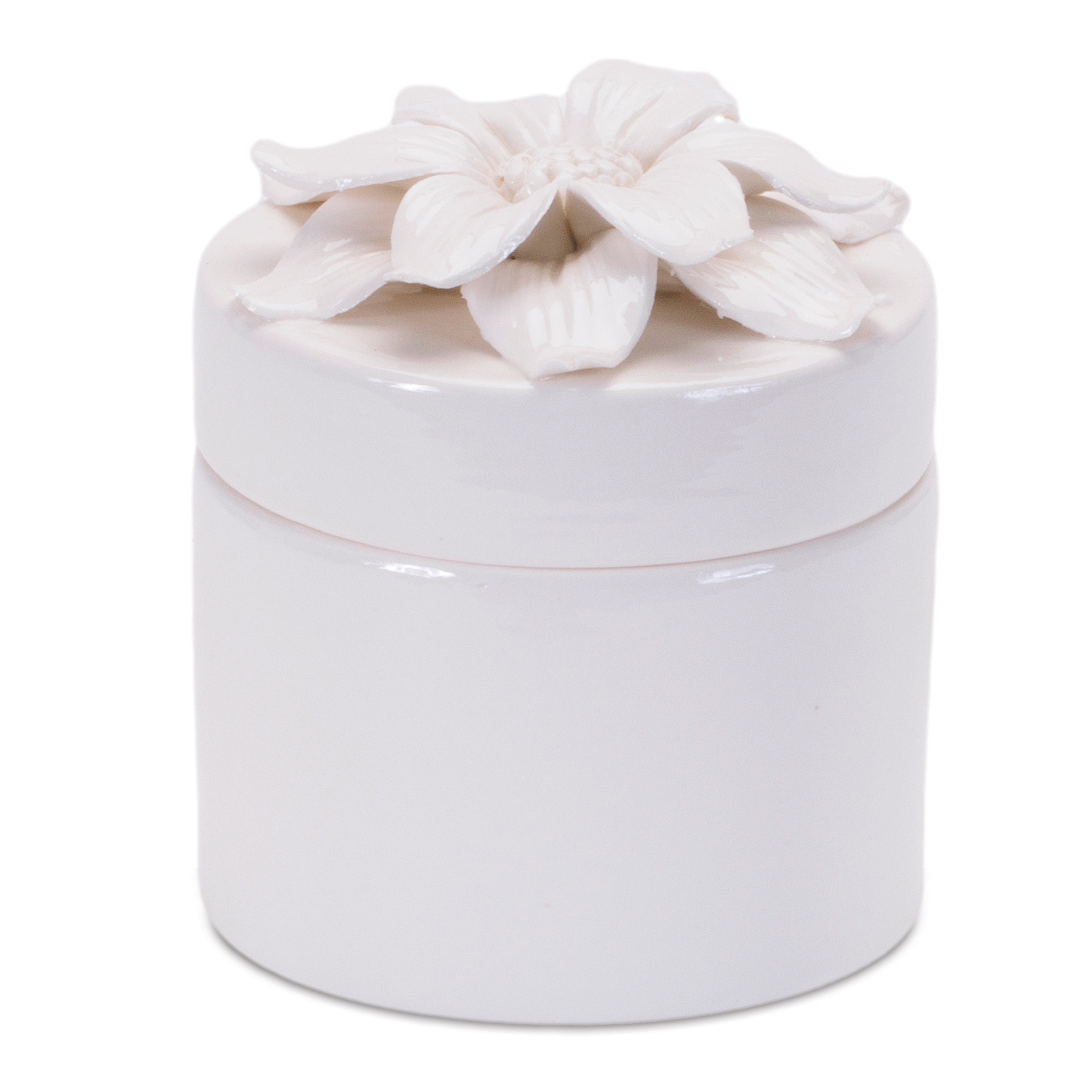 Add charm and elegance to your space with this Set of Stoneware Boxes with Floral Lid Accents. Featuring three assorted designs, each piece features soft white tones with a glossy glazed finish, a classic round shape, and a lid topped with a delicate three-dimensional stoneware flower. Perfect for holding small trinkets, jewelry, or sweet treats, these boxes double as both functional storage and decorative accents. Display them together on a bookshelf, nightstand, or tabletop to add a touch of timeless sophistication to your home.