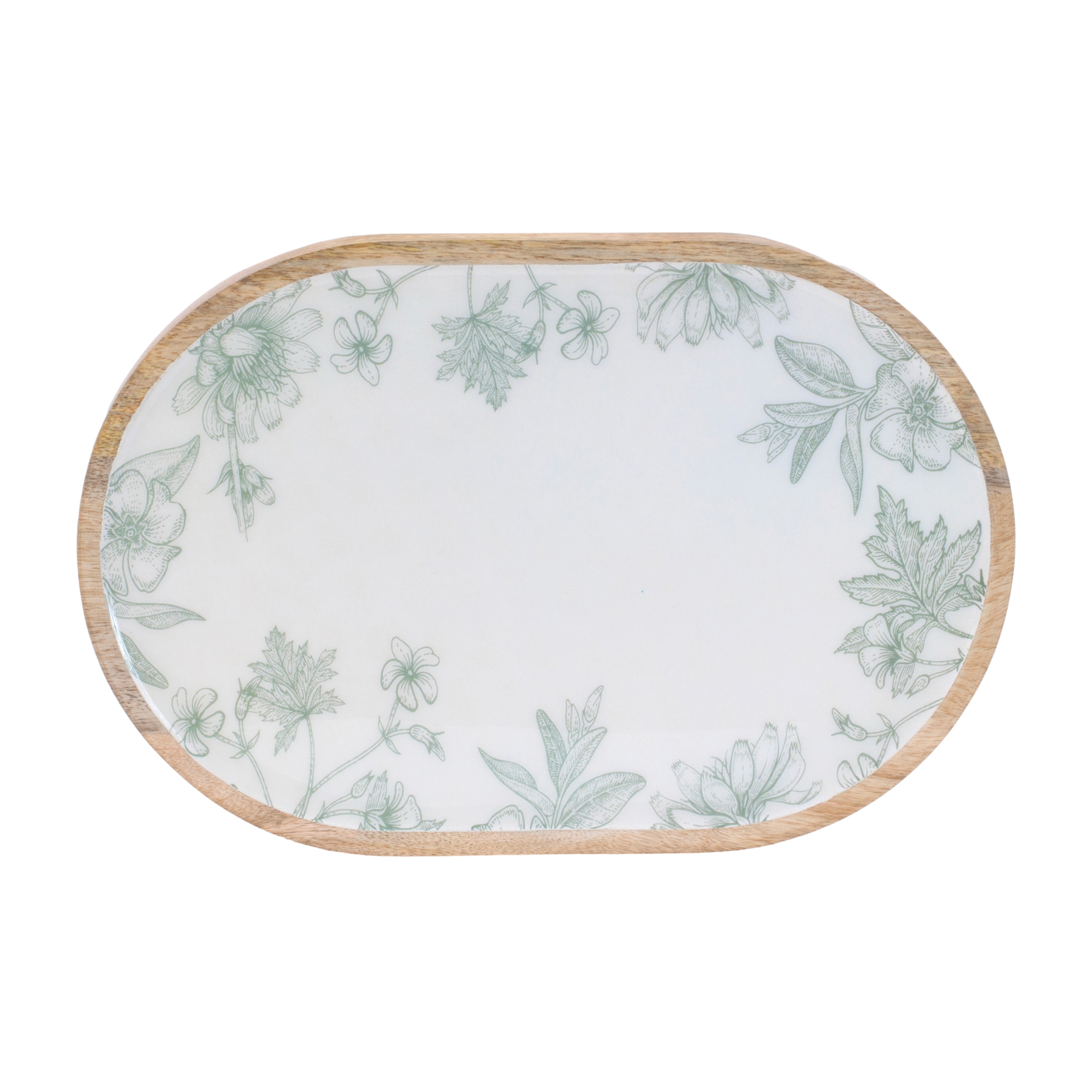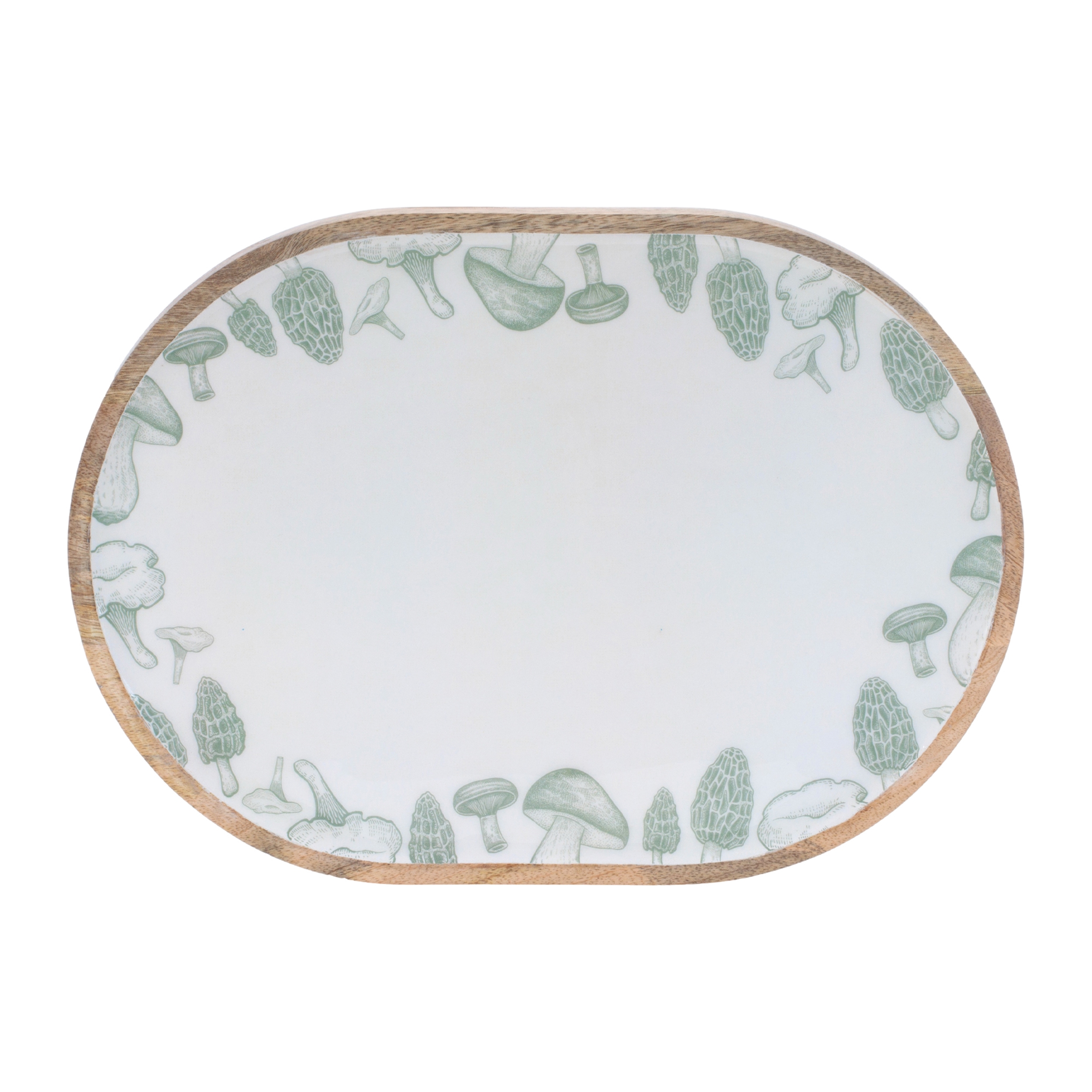 Bring nature's charm to your home with the Wood Mushroom and Floral Print Tray set. Featuring soft white and sage green tones, these trays are complemented by a natural wood grain trim, creating a beautifully rustic yet refined look. Delicate mushroom and floral print outlines add a whimsical touch, making these trays perfect for showcasing your favorite decor. Sold as a set of two assorted sizes and designs, they are ideal for displaying on coffee tables or end tables with vases, candles, or novelty accents. These trays seamlessly fit into garden chic or woodland-inspired decor styles.