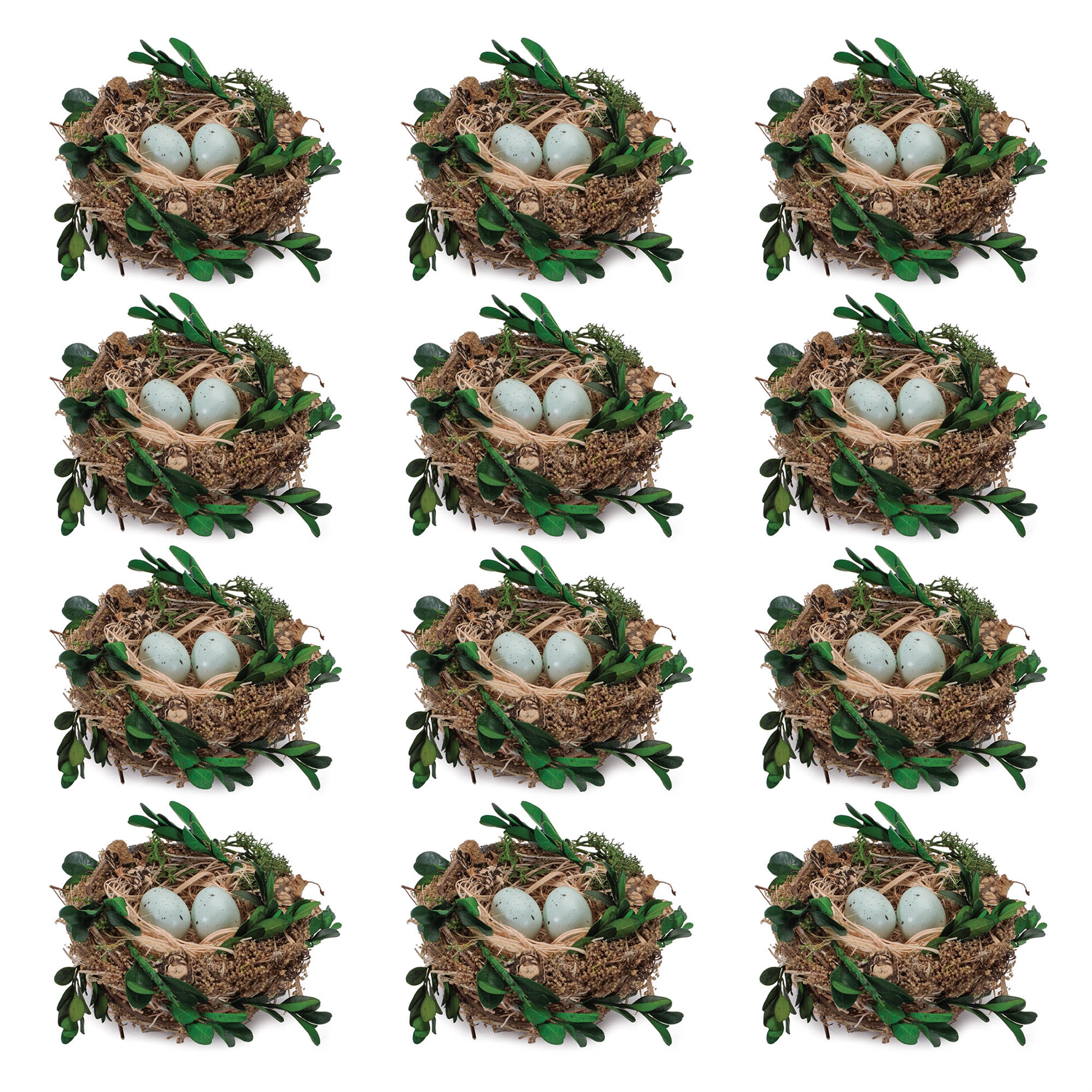 Add a rustic, nature-inspired touch to your decor with this set of 12 charming twig bird nests. Made from natural twigs, boxwood foliage, and delicate robin s eggs, these nests come in earthy brown and green tones, bringing a fresh, springtime feel to any space. Whether displayed alongside bird figurines or inserted into a floral arrangement, wreath, or garland, these nests will add a whimsical, seasonal accent to your home decor.