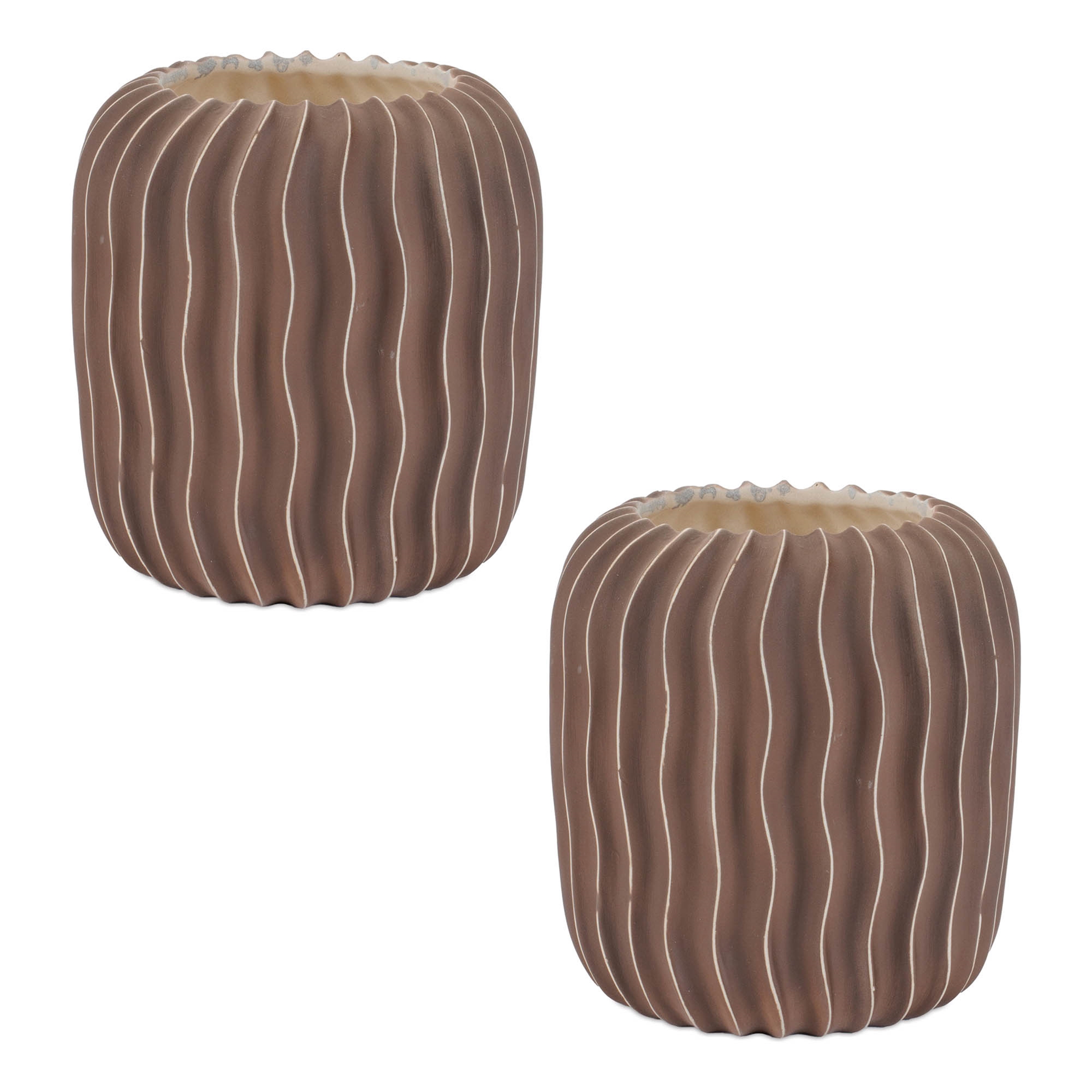 Add a touch of nature to your home with the Wavy Ribbed Ceramic Vase set. Featuring earthy brown and beige tones with an unglazed finish, these vases showcase a modern wavy ribbed design and a rounded cylinder shape. Sold in a set of two matching pieces, they are the perfect addition to your bookshelf, mantle, or coffee table. Whether filled with fresh garden stems or dried florals, these vases will enhance your home decor and add a contemporary flair to any space.
